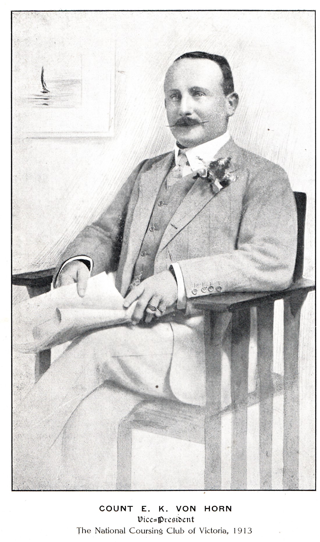 The first President of the National Coursing Club of Australasia Sir W.J. Clark 1877. Plus who said we didn’t have toffs running Coursing here is Count E.K. Von Horn Vice President of the NCA of Victoria 1913. I love his Mo and flowers in the lapel.
