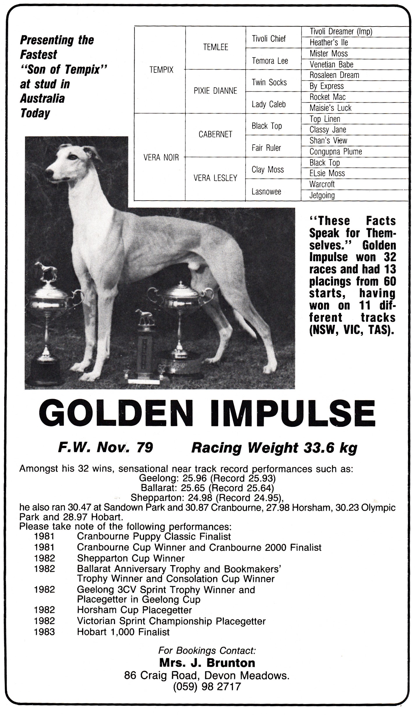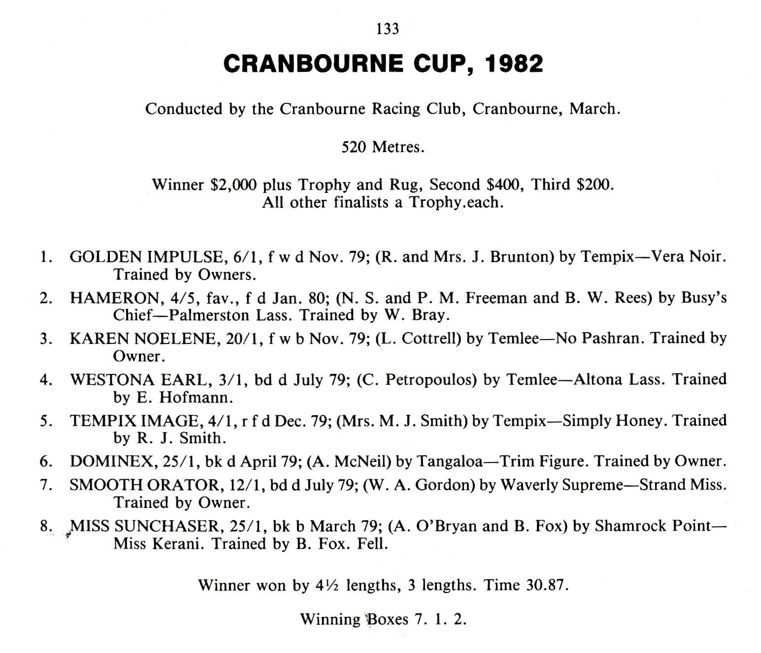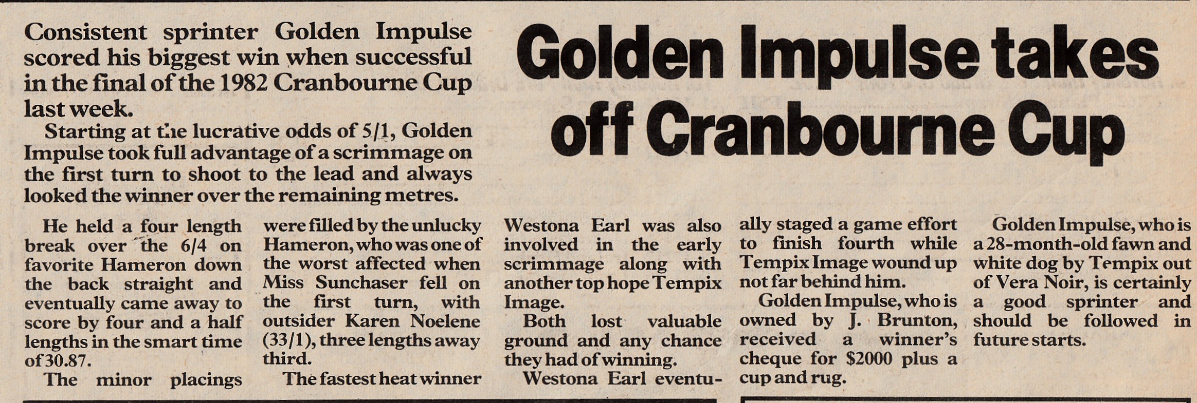 One of the star sprinters of the early 80’s was Golden Impulse. The brilliant son of Tempix raced at the highest level in three states finishing in the money on 45 of his 60 starts. His major feature win was the 1982 Cranbourne Cup.