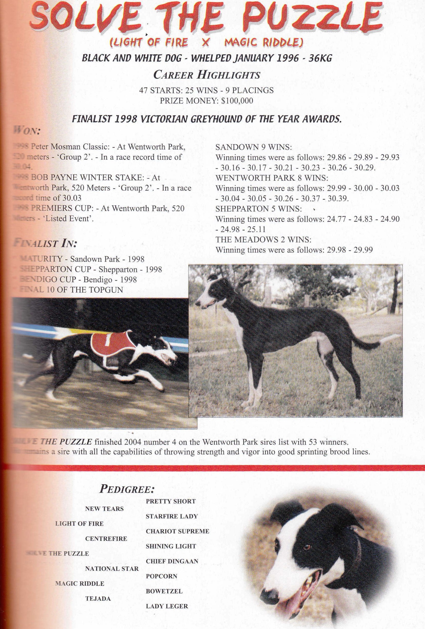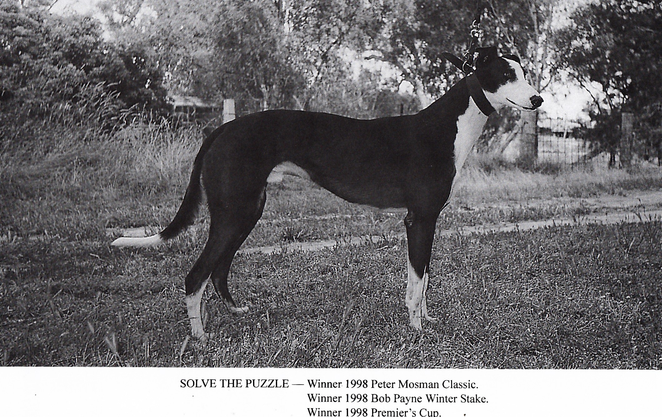 Another top chaser and successful Stud dog was Solve The Puzzle. Raced and bred by Paul Osborne of Goorambat about 16 km’s from Benalla. A great property, I had the pleasure of spending time there many years ago. Solve The Puzzle had an outstanding race year in 1998 as the stats show. As a stud dog he produced 510 litters and 1620 offspring he still has the odd litter on the ground whelped this year. He sadly passed away in June 2007. Some of his best race dogs included Miss Grub, Puzzle Prize, Trip To Eden, Royal Riddle, Taipan Bale, Knockabout Wok, Vee Man Vane, Itza Bee, Remo Rubik, Whippy’s Image, Brother Knows and Kingsbrae Di.