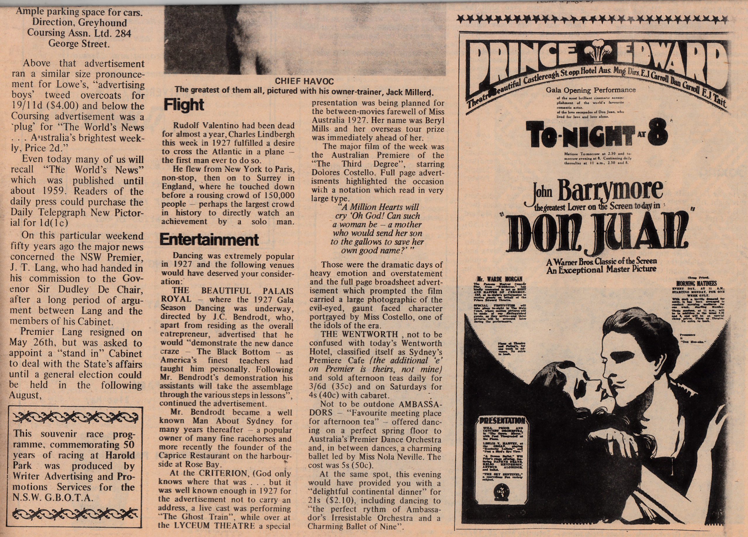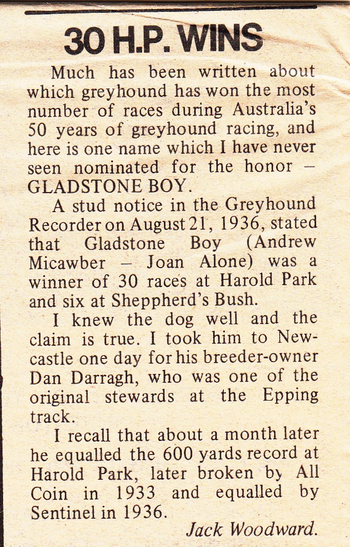 Found an interesting publication celebrating 50 years of Greyhound racing at Harold Park on May 28th, 1977. The special Souvenir Race Programme was printed for the meeting, I like the fact it cost 50 cents. Great front-page stories of the past and some super shots inside a couple I have put here one of Garry Wilson and his champ Woolley Wilson and the late Hec Watt with superstar Zoom Top. I also like the clip from the doyen of Greyhound Journalists the late Jack Woodward about a dog named Gladstone Boy that won no less than 30 races at H.P. Sadly as we know the track closed in 1987. However, I have fond memories of my first race meeting there in January 1971 and also racing my dog Ron’s Champ there in 1987 three meeting before it closed, we ran second.