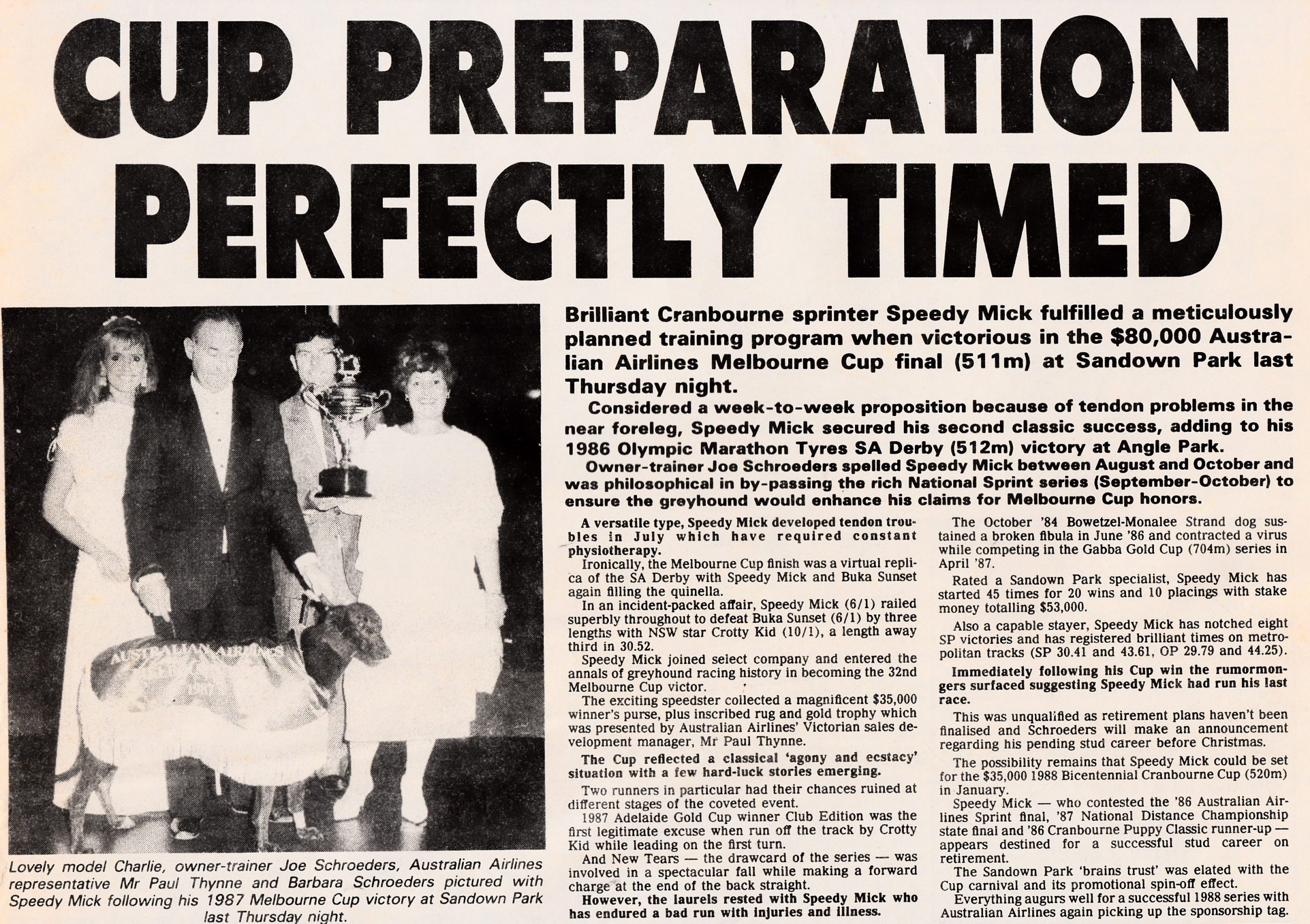 When Yachi Bale stormed home to win last month’s Melbourne Cup. I recalled a similar performance in 1987 by a very versatile greyhound Speedy Mick. He won over both sprint distance at Sandown and Olympic Park. Raced and trained by the late Joe Schroeders. I interview Joe for the Melbourne Cup history tape and he didn’t give much away. Interestingly he retired from training in 1988. Here is two Video’s and two different calls of the race. The Channel 7 footage was put up by GRV Extra.
