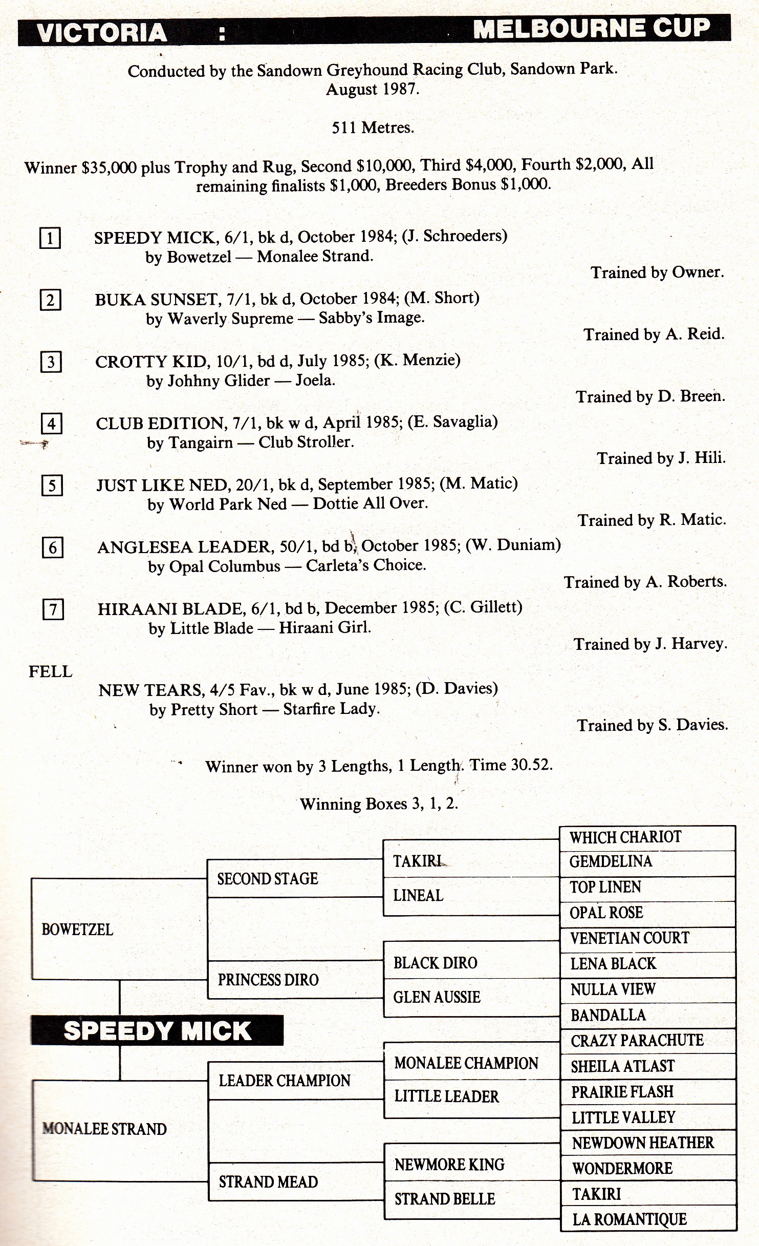 When Yachi Bale stormed home to win last month’s Melbourne Cup. I recalled a similar performance in 1987 by a very versatile greyhound Speedy Mick. He won over both sprint distance at Sandown and Olympic Park. Raced and trained by the late Joe Schroeders. I interview Joe for the Melbourne Cup history tape and he didn’t give much away. Interestingly he retired from training in 1988. Here is two Video’s and two different calls of the race. The Channel 7 footage was put up by GRV Extra.