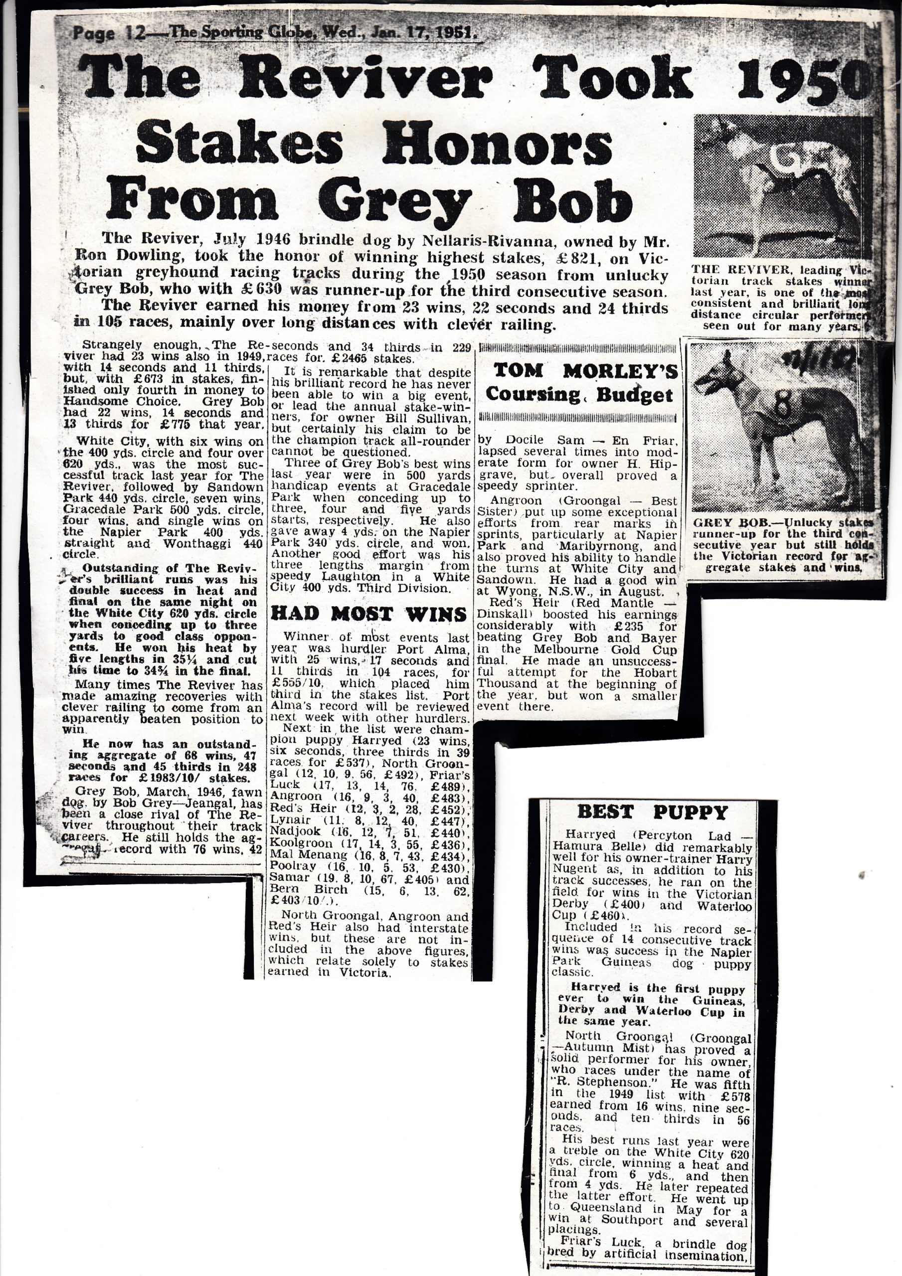 This Sporting Globe report is over 70 years old. Pretty tough dogs back then highest stake earner The Reviver had 105 starts for the year. 23-22-24 in the money 69 times for 821 pound. The other report is about the best Puppy Harryed he won the Guineas, Derby and Waterloo Cup Coursing plus 14 straight at one stage on the track. His coursing events went for three days and seven courses each. Harryed was trained but the master the late Harry Nugent. One of Victoria’s longest licensed trainers in history.