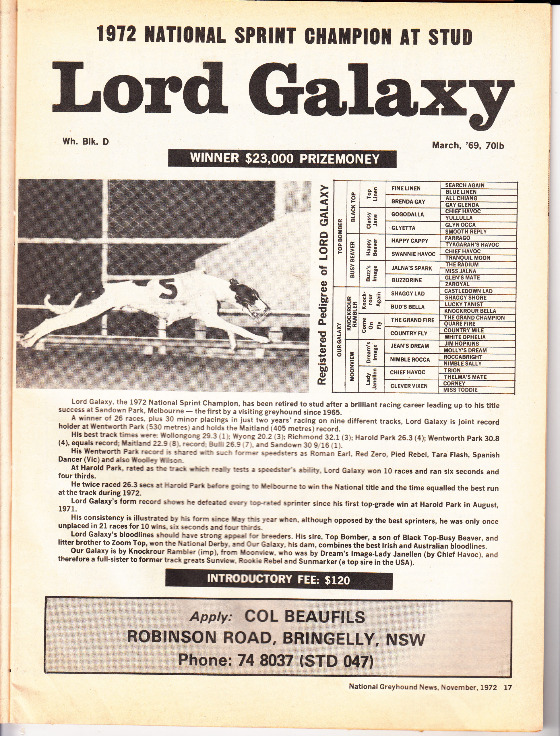 Jeff Collerson – A terrific sprinter for Col Beaufils. Lord Galaxy was sired by Zoom Top’s brother Top Bomber