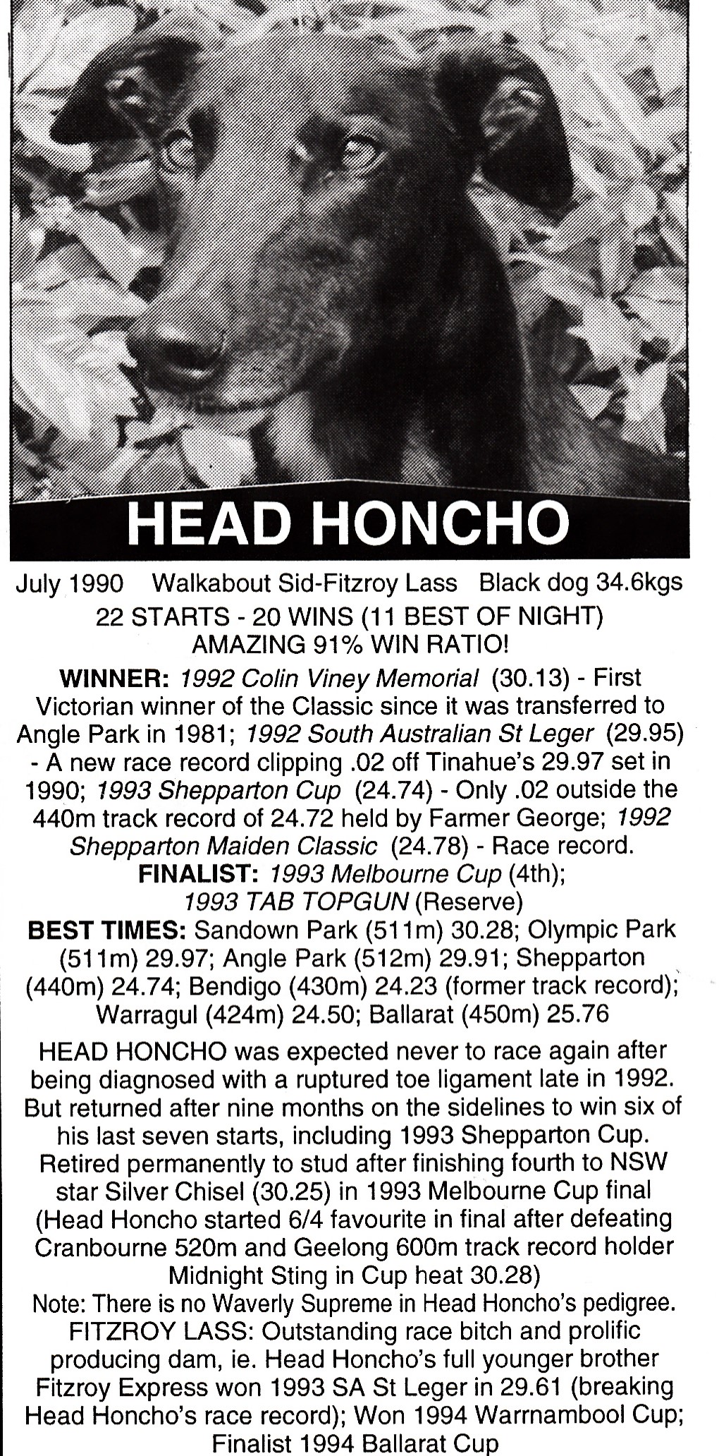Super race dog and Sire Head Honcho. 4,798 offspring winners to numinous to mention over 100 top liners including Carlisle Jack, Go Wild Teddy, No Intent, Bentley Babe, Brookside Red, Clearwater Boy, Wine Glass, Fibba, Mandatario, Jones Junior and Many Tricks. Leading Victorian Sire 1996-2001.