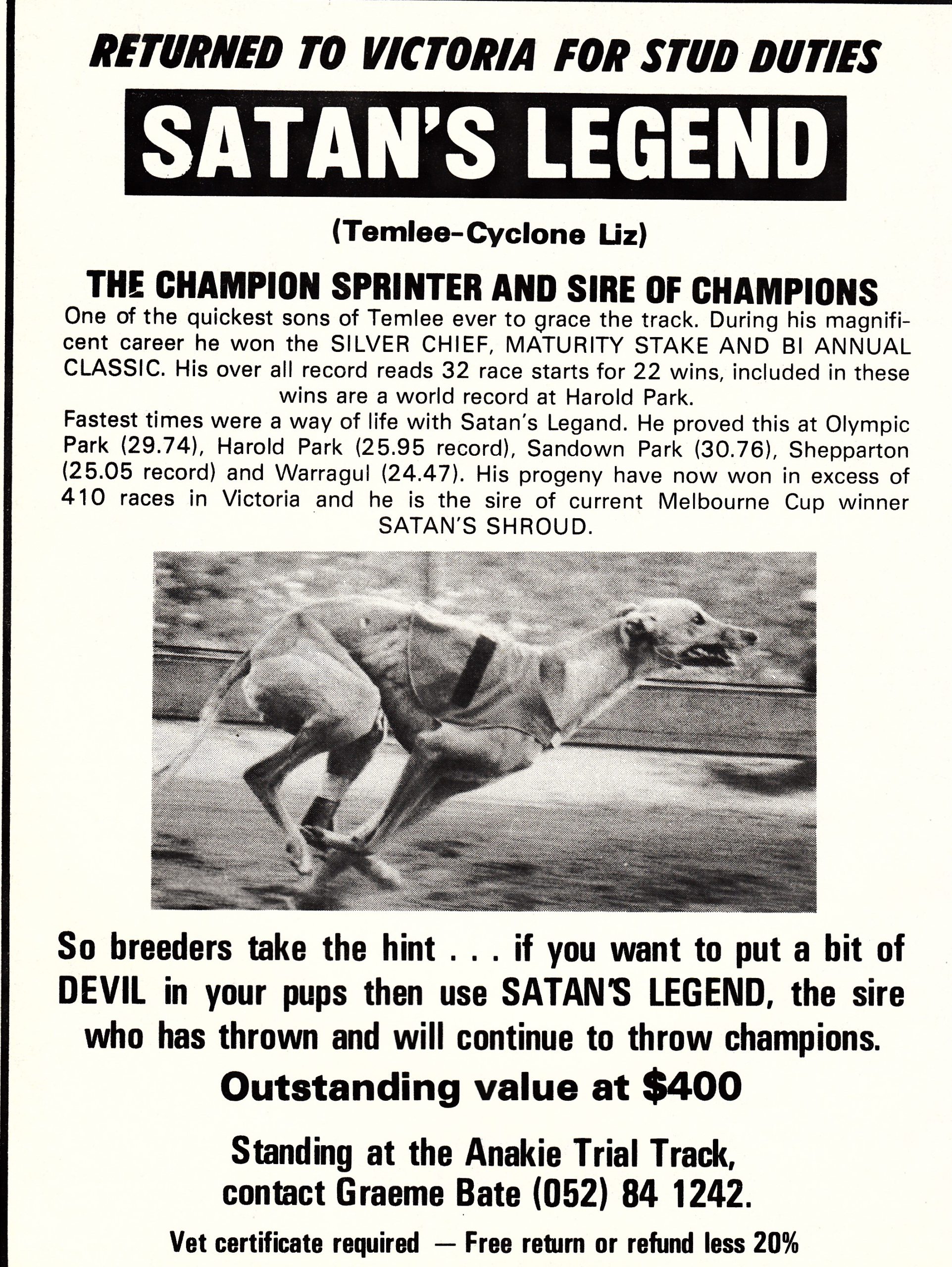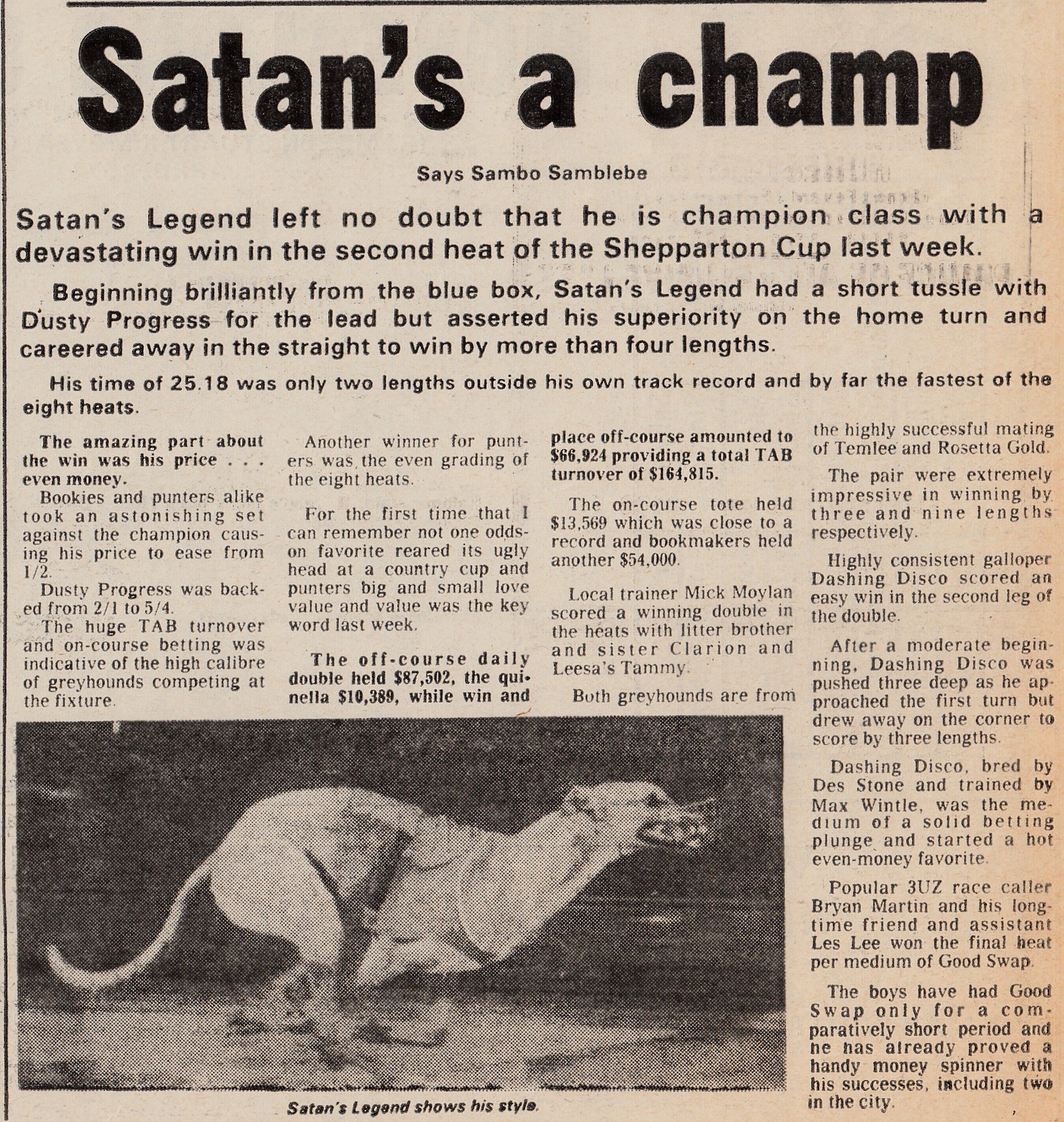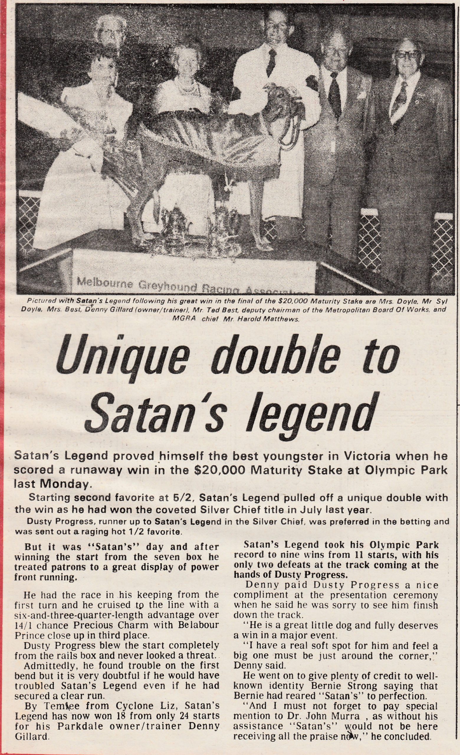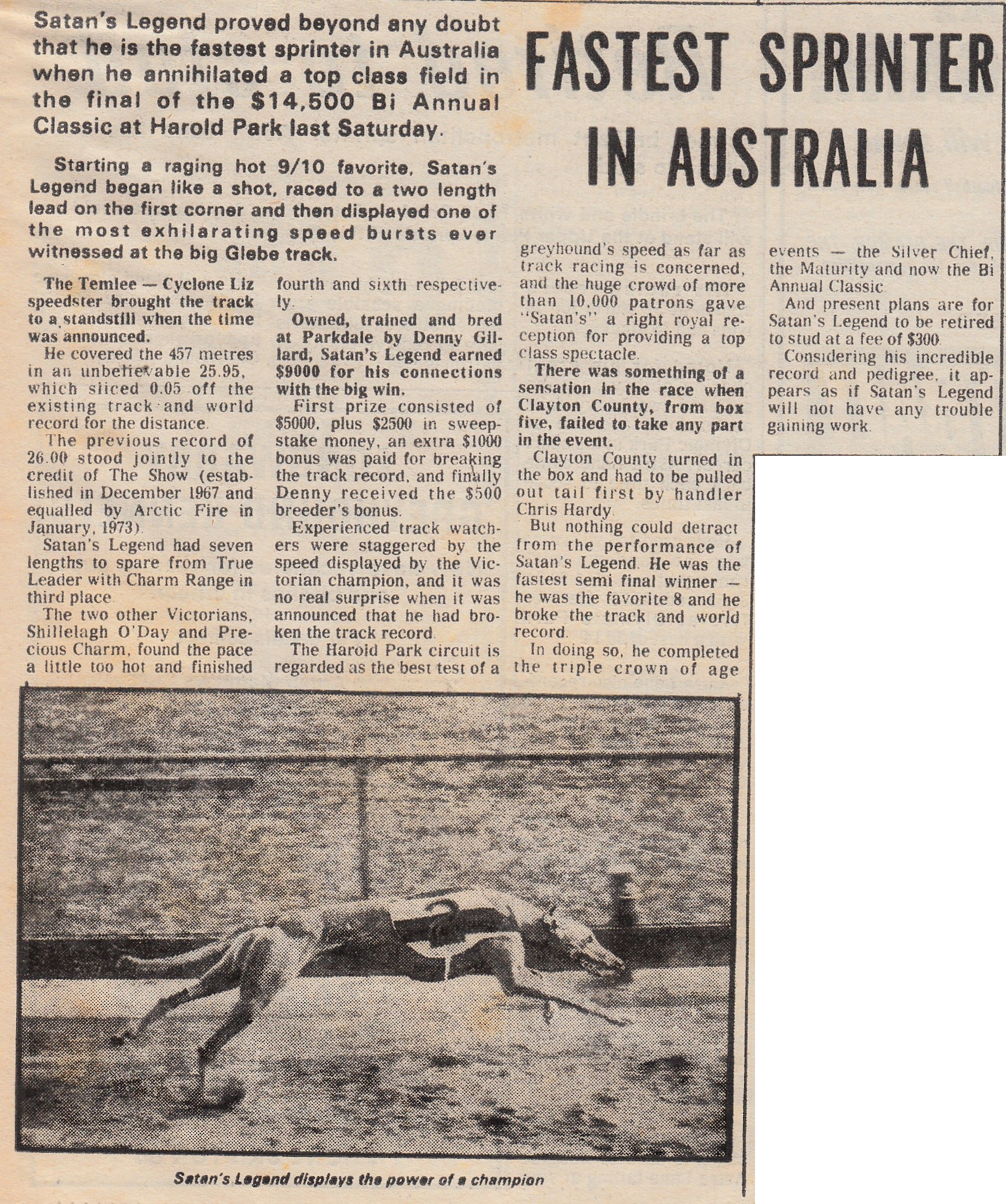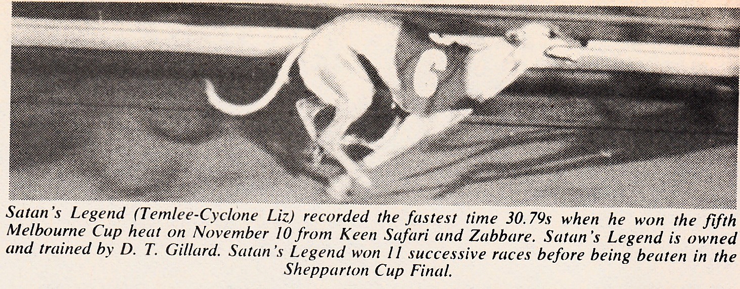 Superstar Sprinter Satan’s Legend. I was asked to find out how long The Shoe’s record at Harold Park stood for. It was not unlike the reign of the mighty Temlee at Olympic Park. Set at 26 even in December 1967, equalled by Arctic Fire in January 1973 and broken by Satan’s Legend in the final of the $14,500 Bi-Annual Classic at Harold Park on Saturday the 25th of March 1978. What a star Satan’s Legend was. Reared by Bernie Strong raced and trained by Denny Gillard and looked after by Dr. John Murray. Won his first 11 straight including the Silverchief and later also won the Maturity. Hard to beat at Olympic Park but also won a heat of the Melbourne Cup in 1977, finishing third behind Mile Post the margins were 1/2 by 3/4 of a length. Here are some articles about the champ.