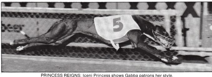 Gerald Lanigan – She was litter sister to Frightful Flash, he went in to be a very successful sire in Ireland. Billy Mcguire trained them both early days, but Iceni Princess did go to Peter and Gloria Gilmore who were based in Tassie at the time. Not sure how that came about. Iceni Princess traced back to a bitch called Venalbion Miss, a very good stayer as was her litter sister Yodel High. Peter Giles raced either Venalbion Miss or her daughter Venalbion Belle. Or maybe both. Des Dooley may remember.