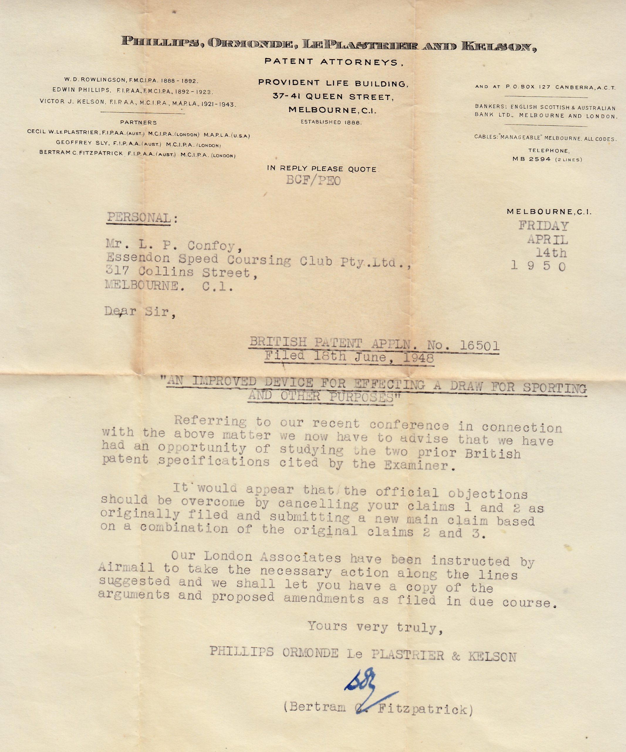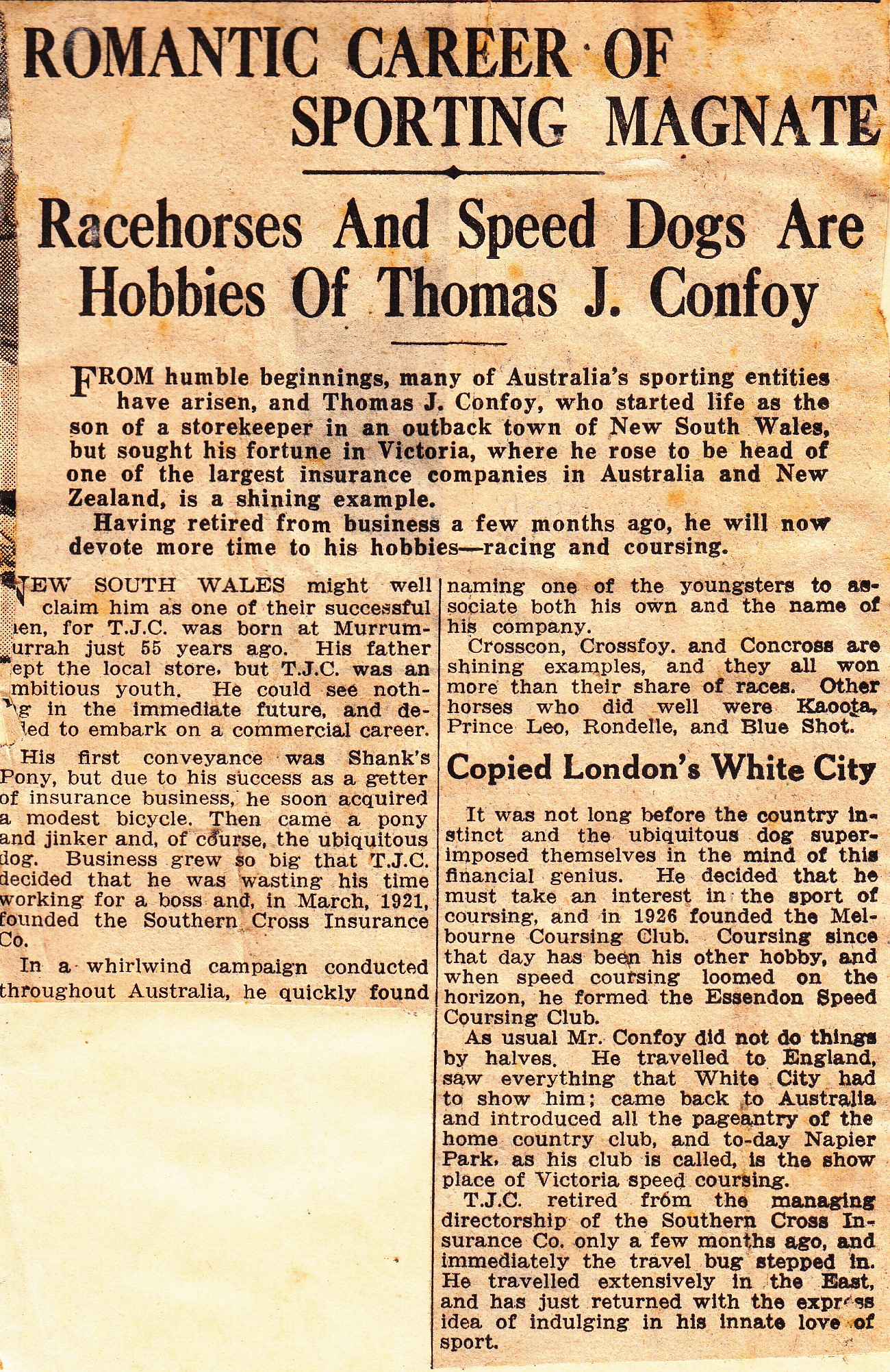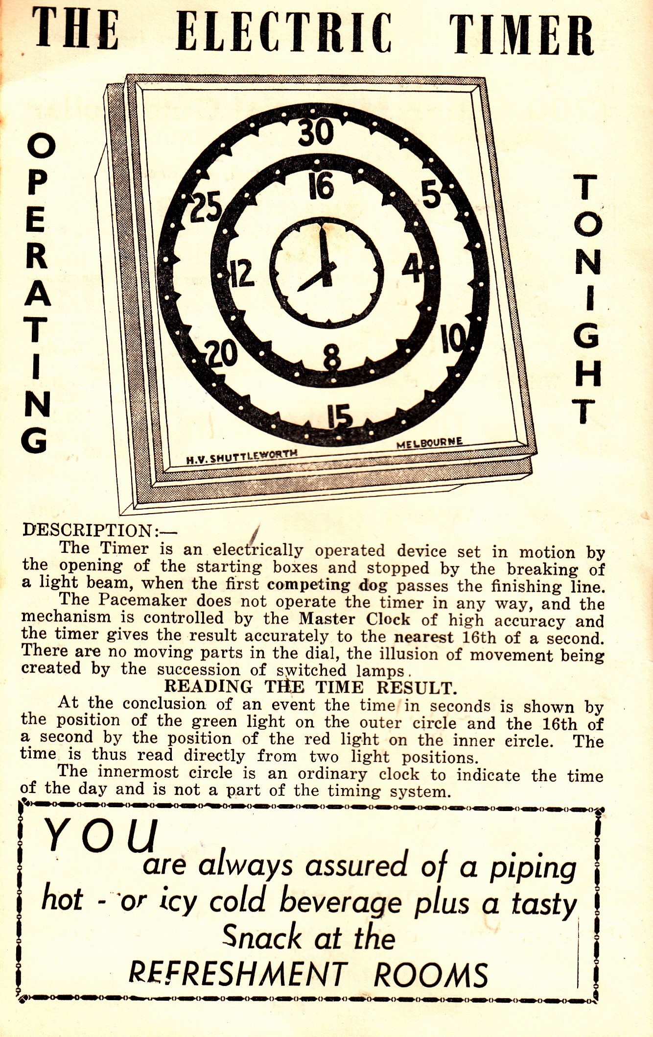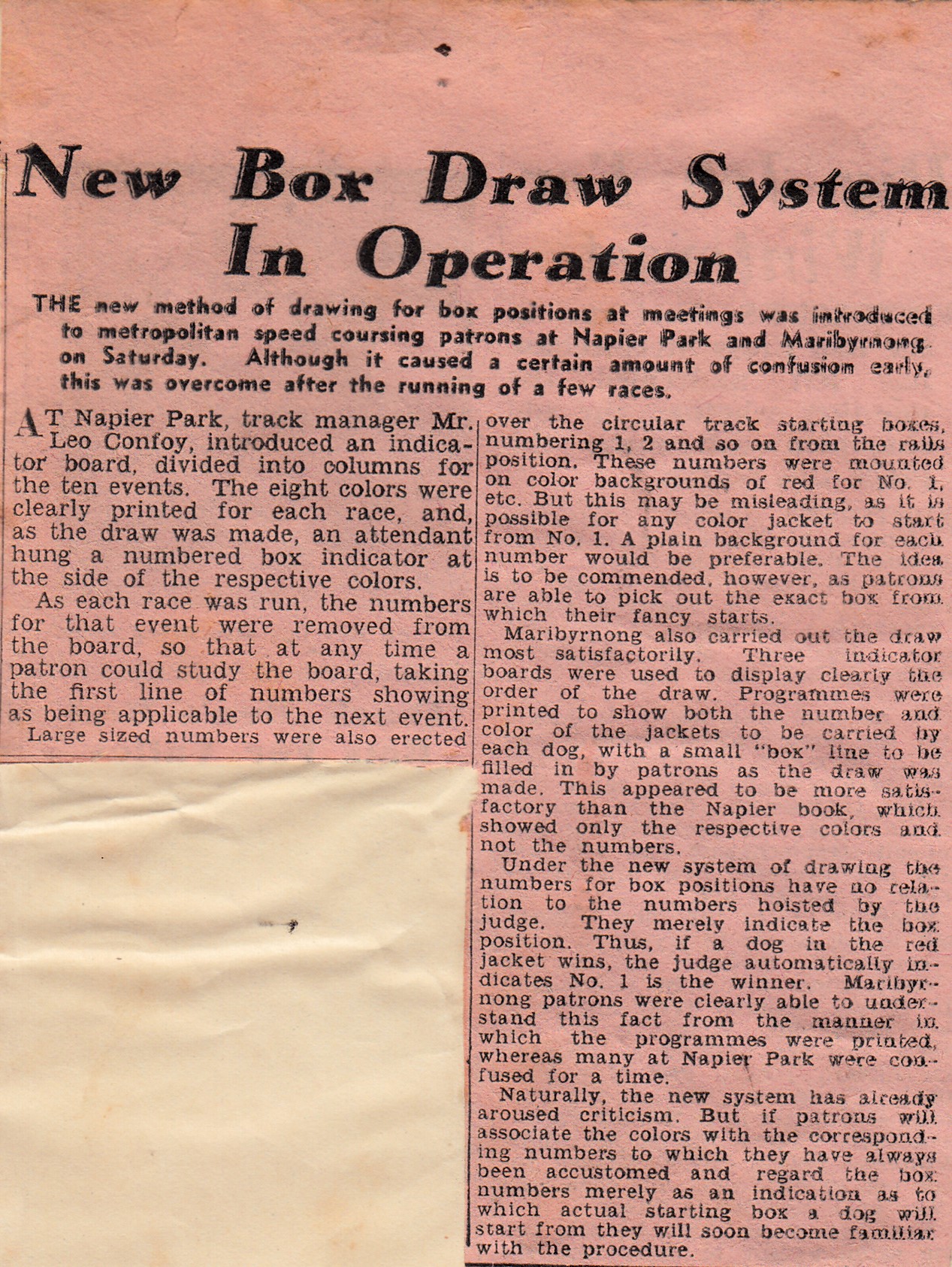 The Confoy name is quite famious in the era of non-proprietary Greyhound Racing. Leo’s father T J Confoy in both Horse racing and Coursing. Leo as the pioneering Manager of Napier Park invented the Box Draw System not only for Greyhound Racing but Sporting Organisations as well. We have the Sandown’s Club original Leo Confoy box draw system on display in the museum as it was used at the old and new track sites. Here is a collection of artifacts and printed stories of how it all unfolded. Including the first Electric Timer used also at Napier Park.