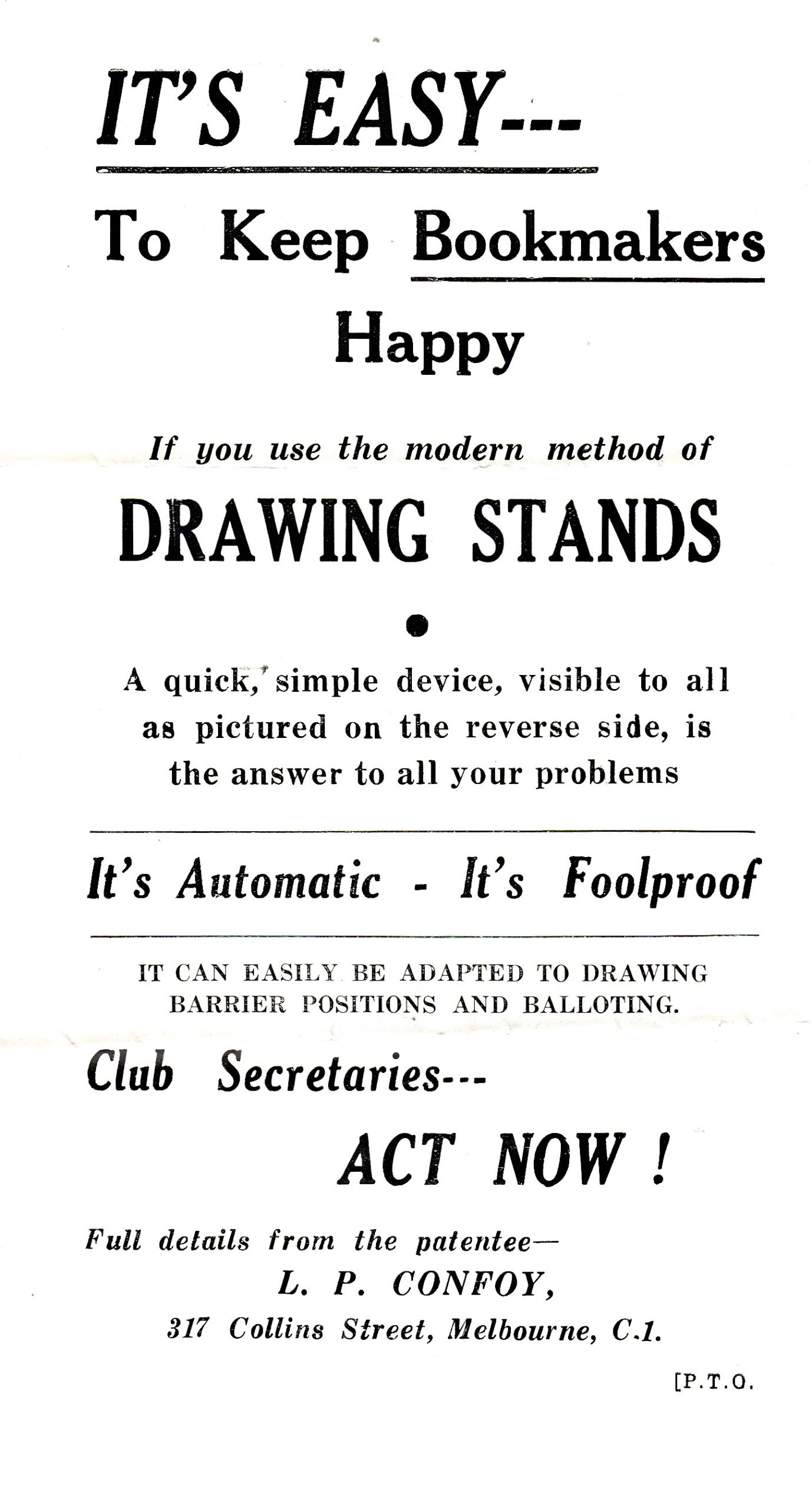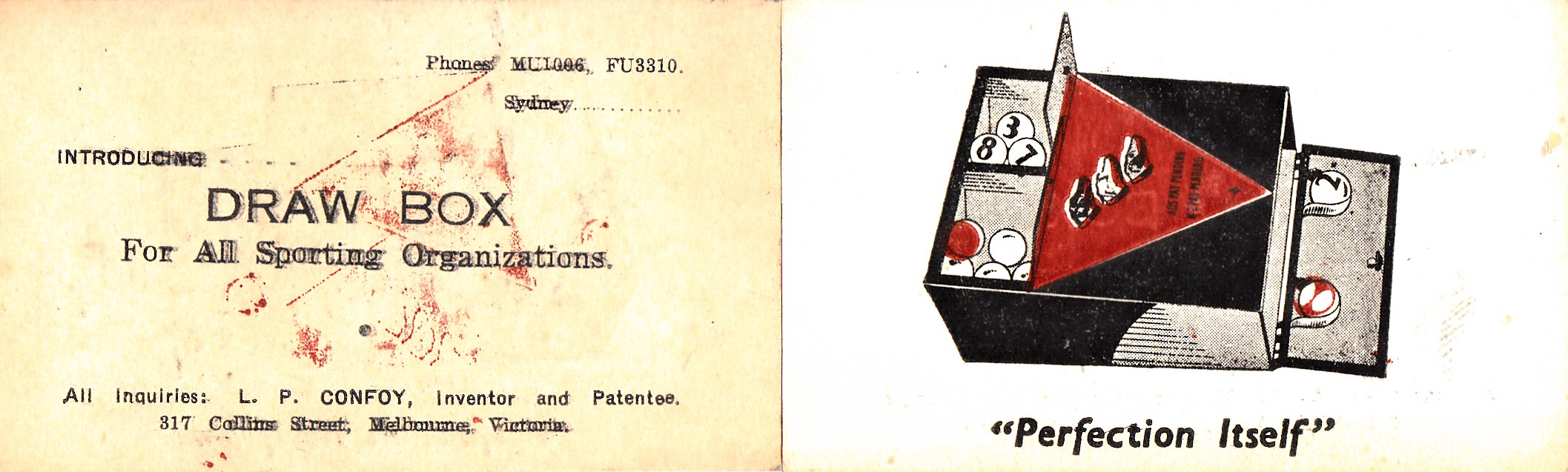 The Confoy name is quite famious in the era of non-proprietary Greyhound Racing. Leo’s father T J Confoy in both Horse racing and Coursing. Leo as the pioneering Manager of Napier Park invented the Box Draw System not only for Greyhound Racing but Sporting Organisations as well. We have the Sandown’s Club original Leo Confoy box draw system on display in the museum as it was used at the old and new track sites. Here is a collection of artifacts and printed stories of how it all unfolded. Including the first Electric Timer used also at Napier Park.