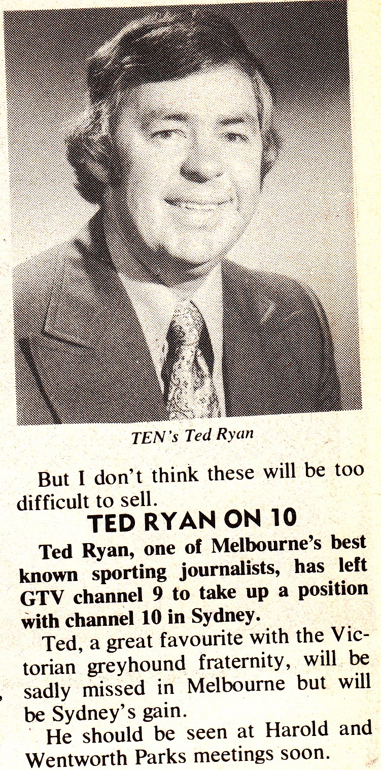 My fondest memories of working with Ted were at Pub-Tab promotions where we would take a greyhound to the Hotel. Ted would do live cross’ to 3UZ’s Brian Mazoletti. One night at the Middle Hotel in Mordialloc an all-in brawl erupted in the public bar. Ted never missed a beat explaining to Brian how well everything was going while my Greyhound Baghdad Beggar barked encouragement to the brawlers with his front paws up on the Pool table.