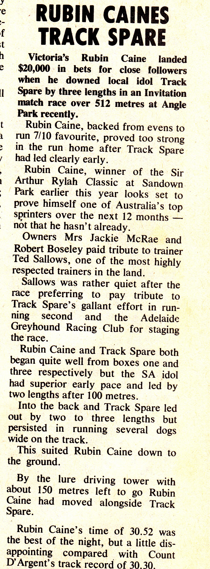 Marg Sallows remembers – sure do…he should have won the Adelaide Cup too ….but the buddy lure broke in the home strait…..The only 2 dogs that didn’t fall came 1st and 2nd the re-run the following week.