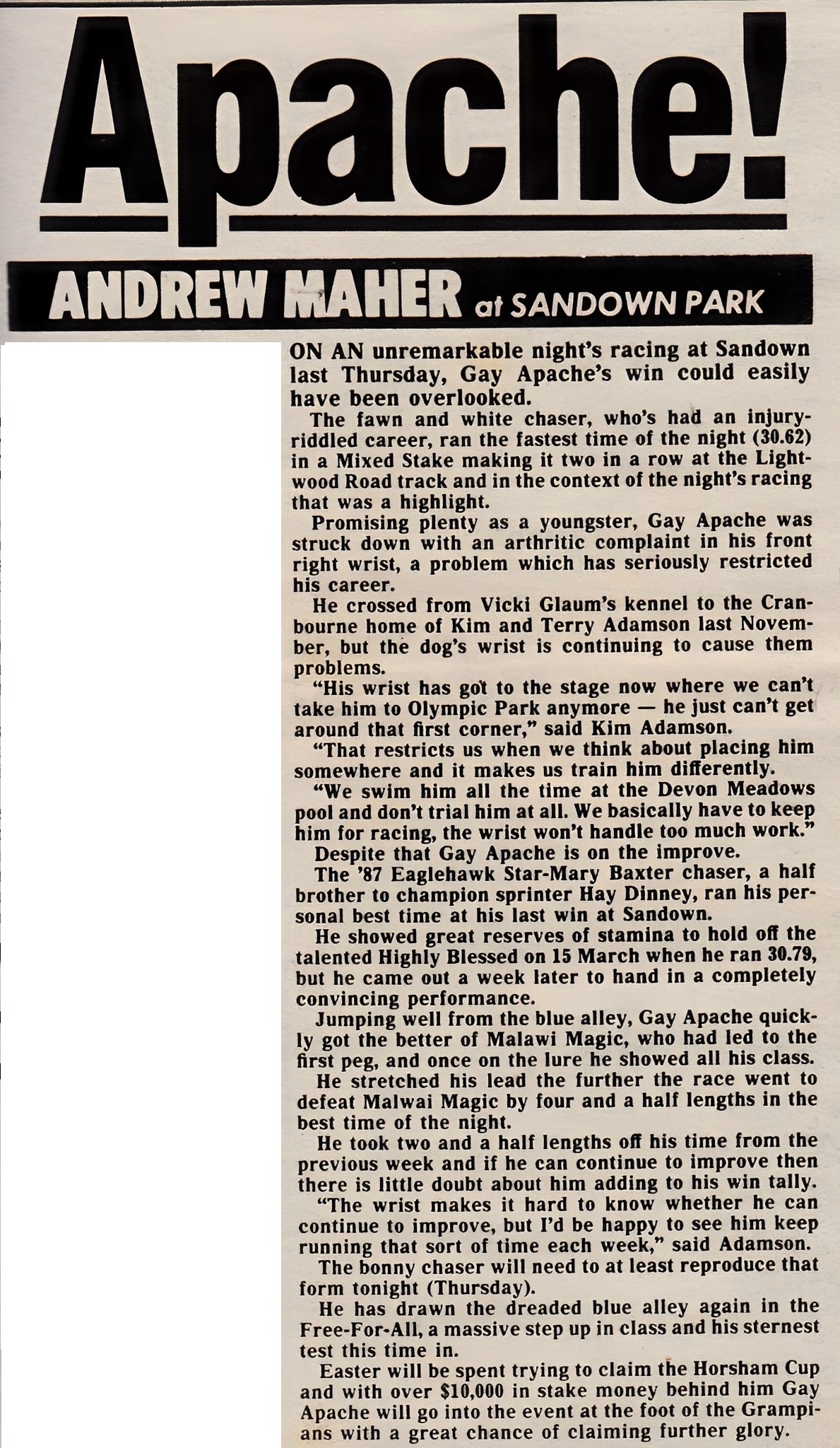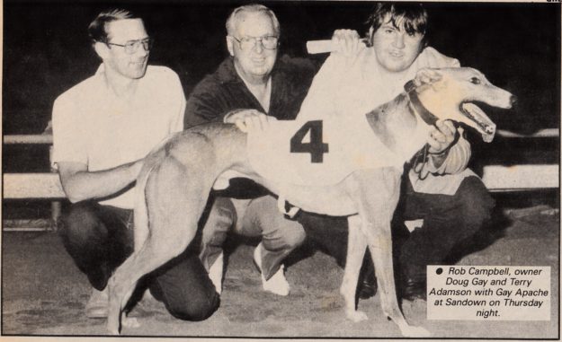 One of, if not the best Lure drivers in Victoria is Terry Adamson. Born into greyhounds he was a very handy trainer like his dad Clem. Here he is as young bloke with his handy sprinter Gay Apache. Bred in the purple by Eaglehawk Star from Mary Baxter. He had 54 starts for 13 wins and 18 placings winning over $12,000 in the early 90’s. He won at Sandown, Olympic, Cranbourne, Geelong, Warragul, Shepparton and Traralgon.