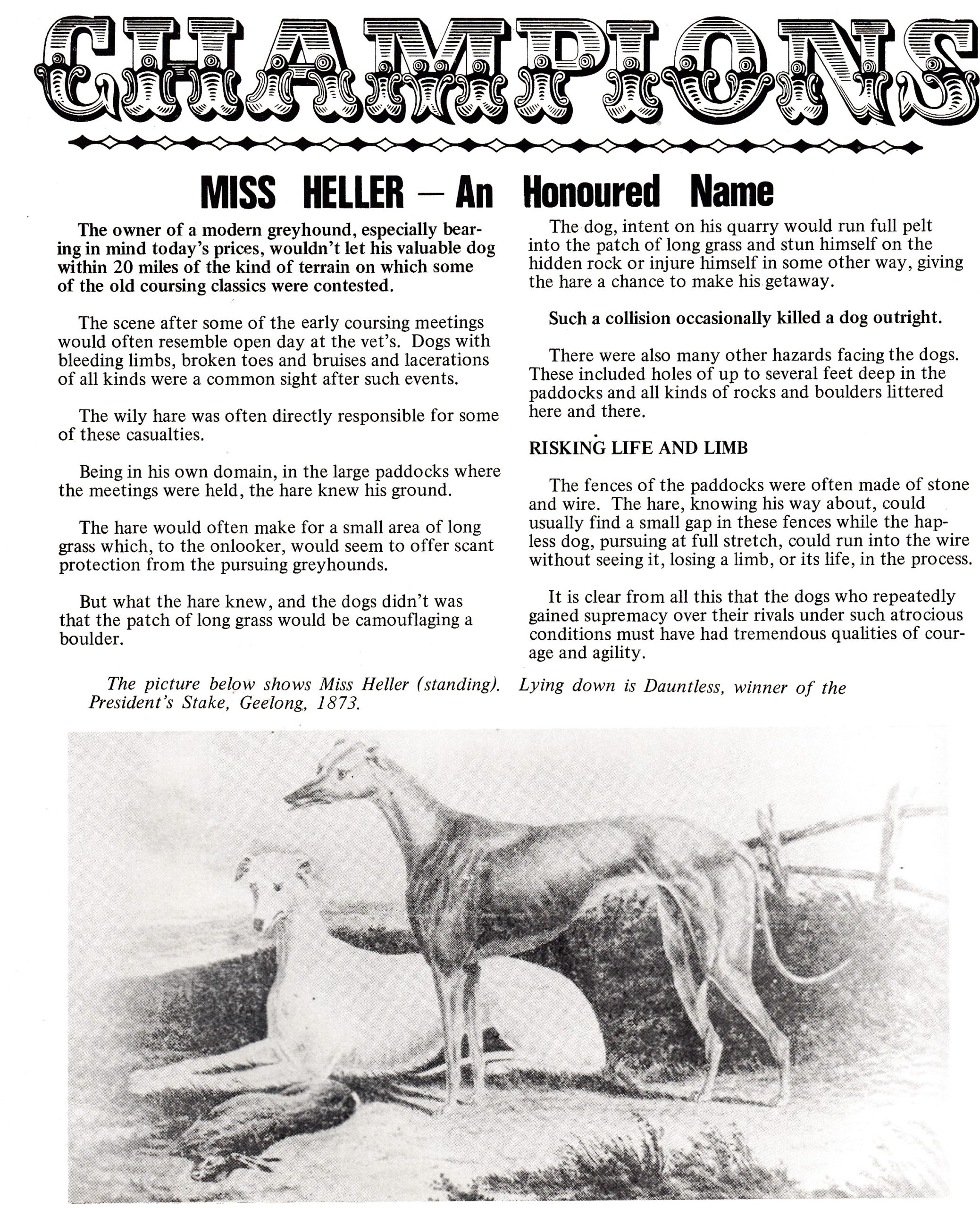 The first Victorian Waterloo Cup winner 1873 Miss Heller standing. Laying down is Dauntless winner of the President’s Stake, Geelong 1873.