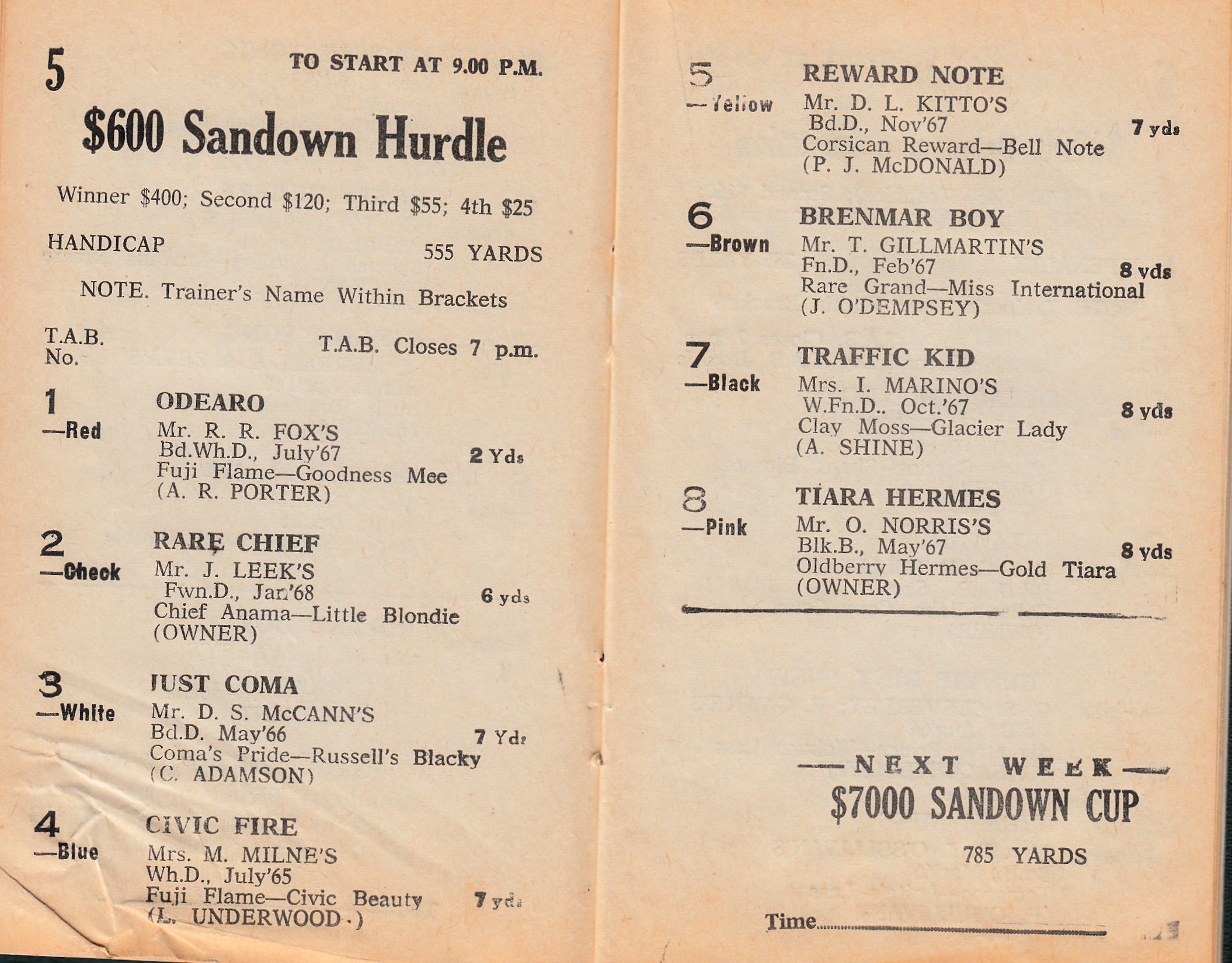 54 years ago this month February 2024, Sandown hosted the Victorian Governor Sir Rohan Delacombe. A highly decorated English Military man with more letters after his name than I have ever seen. So big was the occasion the club made a hard copy racebook. He would have sat in the old timber stand in box as pictured below. I remember the night the Governor was there. A couple of cracking races were on that night and his race was a lead up to the Sandown Cup in those days held in February. Some staying stars of the day took part Delacombe Boy, Bunyip Bint, Miram Miss, Worthy View and Jeta Girl. The Hurdle featured my all-time favourite Hall of Famer Odero he was off 2 yards and ran second to another champ that night Rare Chief. He later won off scratch as his race record records in October of 1970.