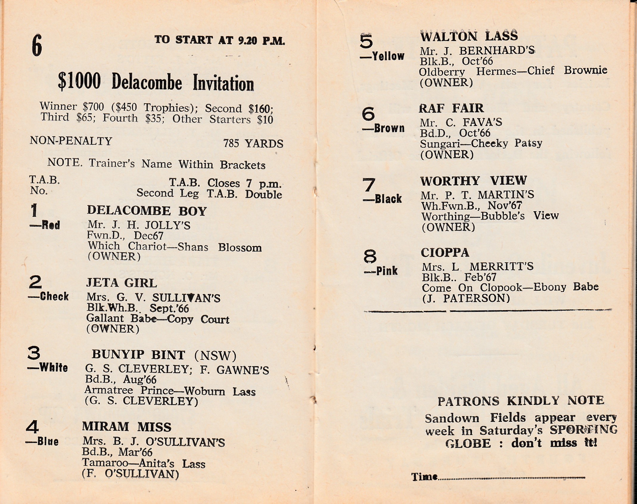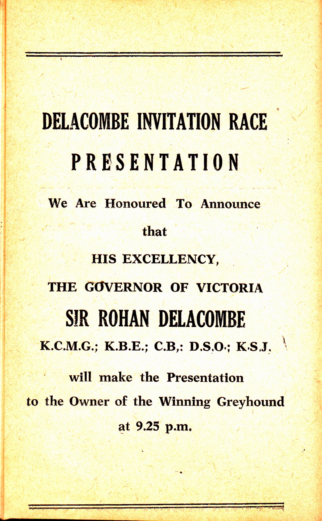 54 years ago this month February 2024, Sandown hosted the Victorian Governor Sir Rohan Delacombe. A highly decorated English Military man with more letters after his name than I have ever seen. So big was the occasion the club made a hard copy racebook. He would have sat in the old timber stand in box as pictured below. I remember the night the Governor was there. A couple of cracking races were on that night and his race was a lead up to the Sandown Cup in those days held in February. Some staying stars of the day took part Delacombe Boy, Bunyip Bint, Miram Miss, Worthy View and Jeta Girl. The Hurdle featured my all-time favourite Hall of Famer Odero he was off 2 yards and ran second to another champ that night Rare Chief. He later won off scratch as his race record records in October of 1970.