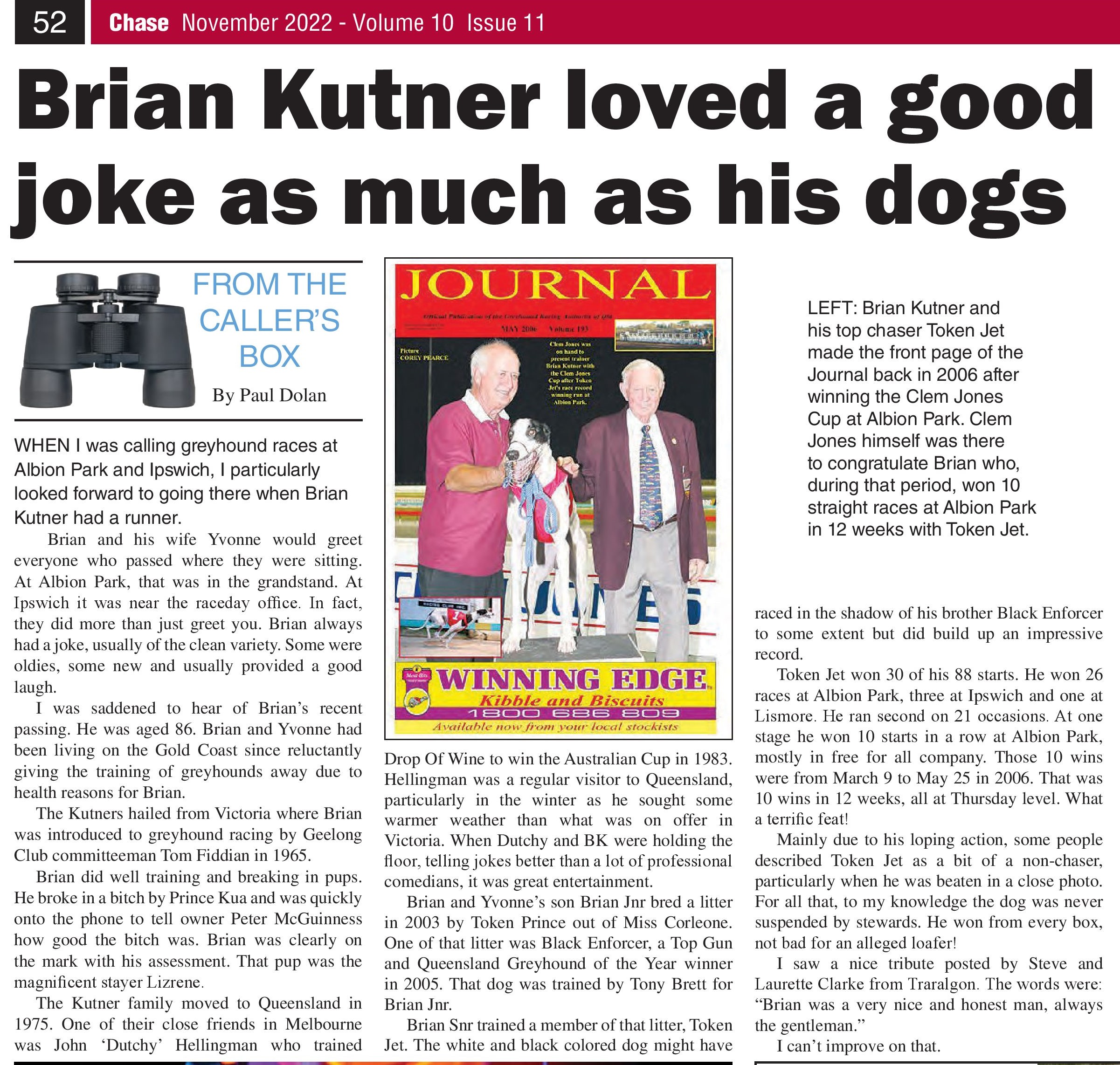 In early October we lost another great greyhound man in Brian Kutner. His son left this note and Paul Dolan wrote a lovely piece in the Chase. Just a short note to say my Father Brian Kutner passed away on Sunday after battling illness.
