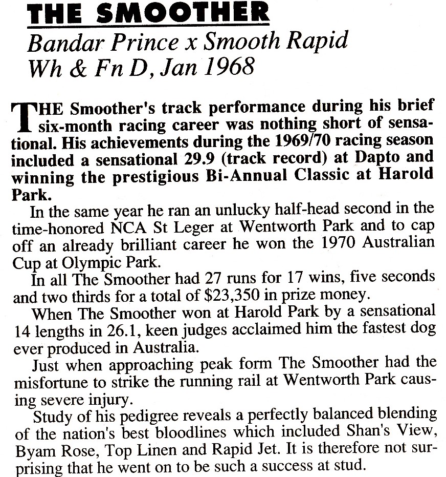 Brilliant 1970 Australian Cup winner The Smoother. I remember the night well backed the Cup winner The Smoother, big white dog from NSW off the red. I was sunburnt badly on the Sunday and couldn’t brush against anyone in the packed betting ring. It was one of my favourite Australian Cup winners The Smoother with his short racetrack career of six months. He proved a bonus at stud producing the likes of All Design, El Gazelle, Dusty Trail, Kim’s Monaro, Emiline Bale, Steelflex and True Leader among his progeny. The Smoother died in January 1977, aged just nine.