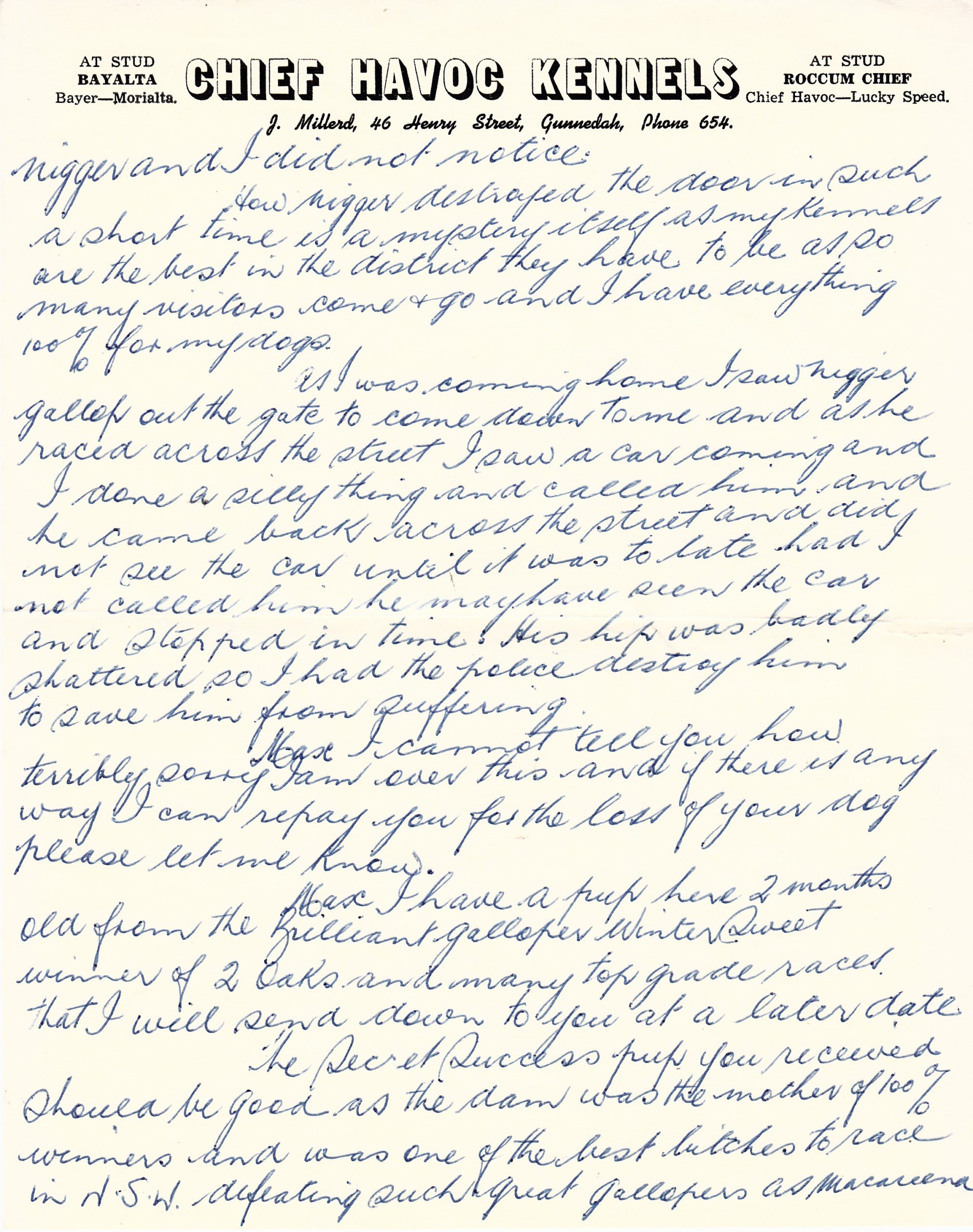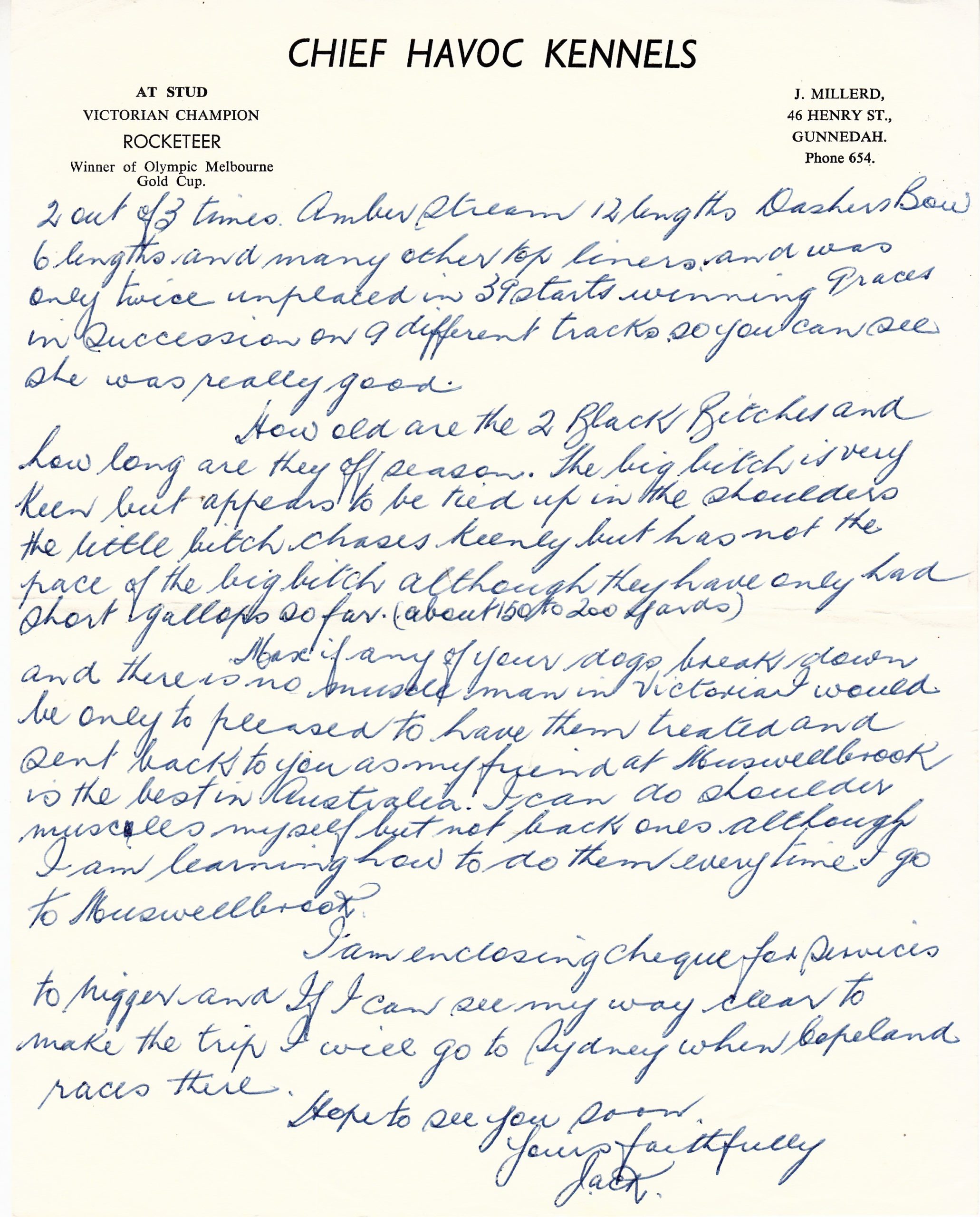Rocketeer stood at stud for legendary Gunnedah trainer Jack Millerd Jack raced and stood Hall of Famer Chief Havoc. Also found in the Sandown Safe is an extraordinary handwritten letter Jack wrote to Max Johnson on the sad passing of “Nigger” Rocketeer’s kennel name. It was a tragic car accident after Rocketeer escaped his kennel while Jack was trialing pups. Amazingly Jack Millard died in the same way struck down in the main street of the New South Wales country town.