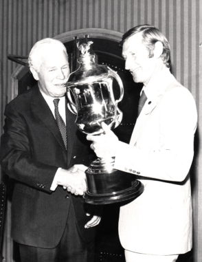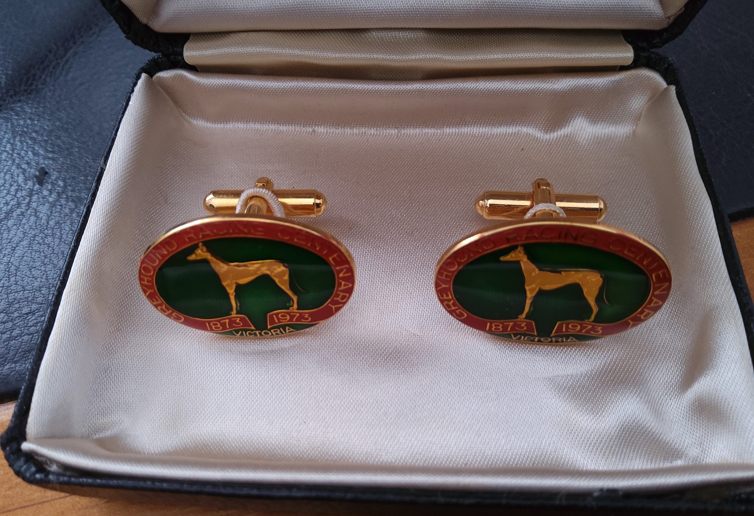 Steve Hunt son of former GRV Chief Steward and Sandown GRC manager Tom Hunt sent me these beautiful set of Cufflinks given to his father at the occasion of the 100th Centenary Dinner held at the Old Melbourne Motor Inn in September 1973. 400 guests from around Australia attended the event sponsored by the Victoria Coursing Club. The Centenary Waterloo Cup had been held at Geelong Racecourse. Here the Governor of Victoria His excellency Major -General Sir Rohan Delacombe is presenting the Cup to Sil Rishworth after his greyhound Gadoni had won the event. The other pic is the 12th President of the National Coursing Association of Victoria Mr Silvester Doyle welcoming all to the dinner. Steve also worked for Sandown in the 70’s as a groundsman and Lure driver. I found a couple of photos involving Tom. The Cufflinks will be displayed upstairs at Sandown with thanks to his family.