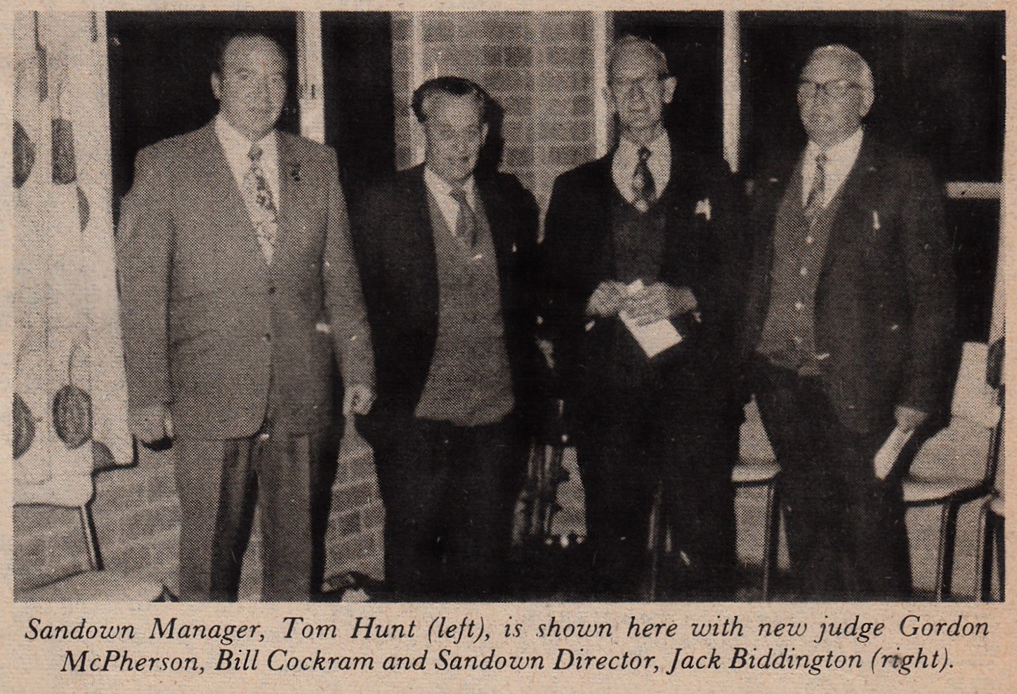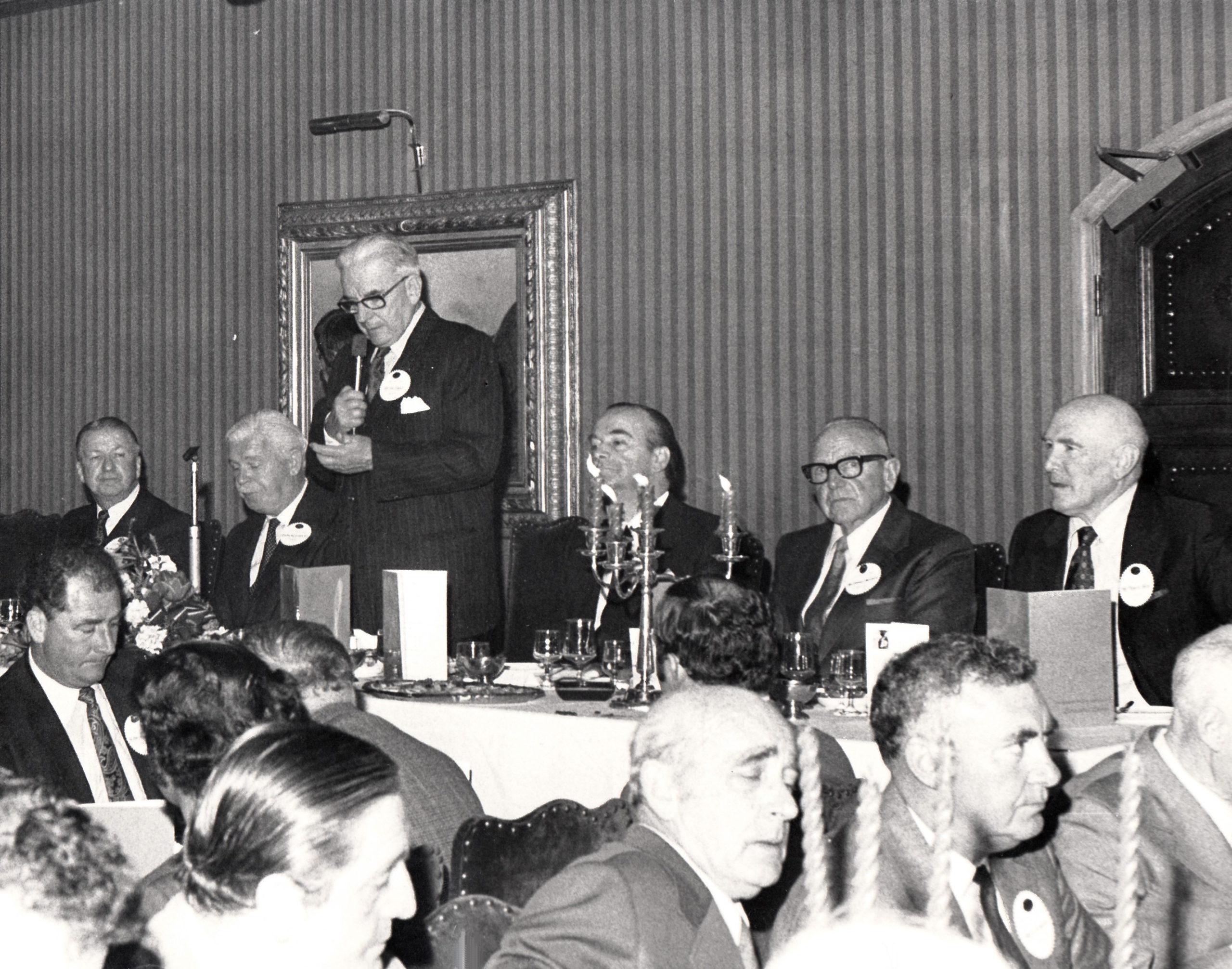 Steve Hunt son of former GRV Chief Steward and Sandown GRC manager Tom Hunt sent me these beautiful set of Cufflinks given to his father at the occasion of the 100th Centenary Dinner held at the Old Melbourne Motor Inn in September 1973. 400 guests from around Australia attended the event sponsored by the Victoria Coursing Club. The Centenary Waterloo Cup had been held at Geelong Racecourse. Here the Governor of Victoria His excellency Major -General Sir Rohan Delacombe is presenting the Cup to Sil Rishworth after his greyhound Gadoni had won the event. The other pic is the 12th President of the National Coursing Association of Victoria Mr Silvester Doyle welcoming all to the dinner. Steve also worked for Sandown in the 70’s as a groundsman and Lure driver. I found a couple of photos involving Tom. The Cufflinks will be displayed upstairs at Sandown with thanks to his family.