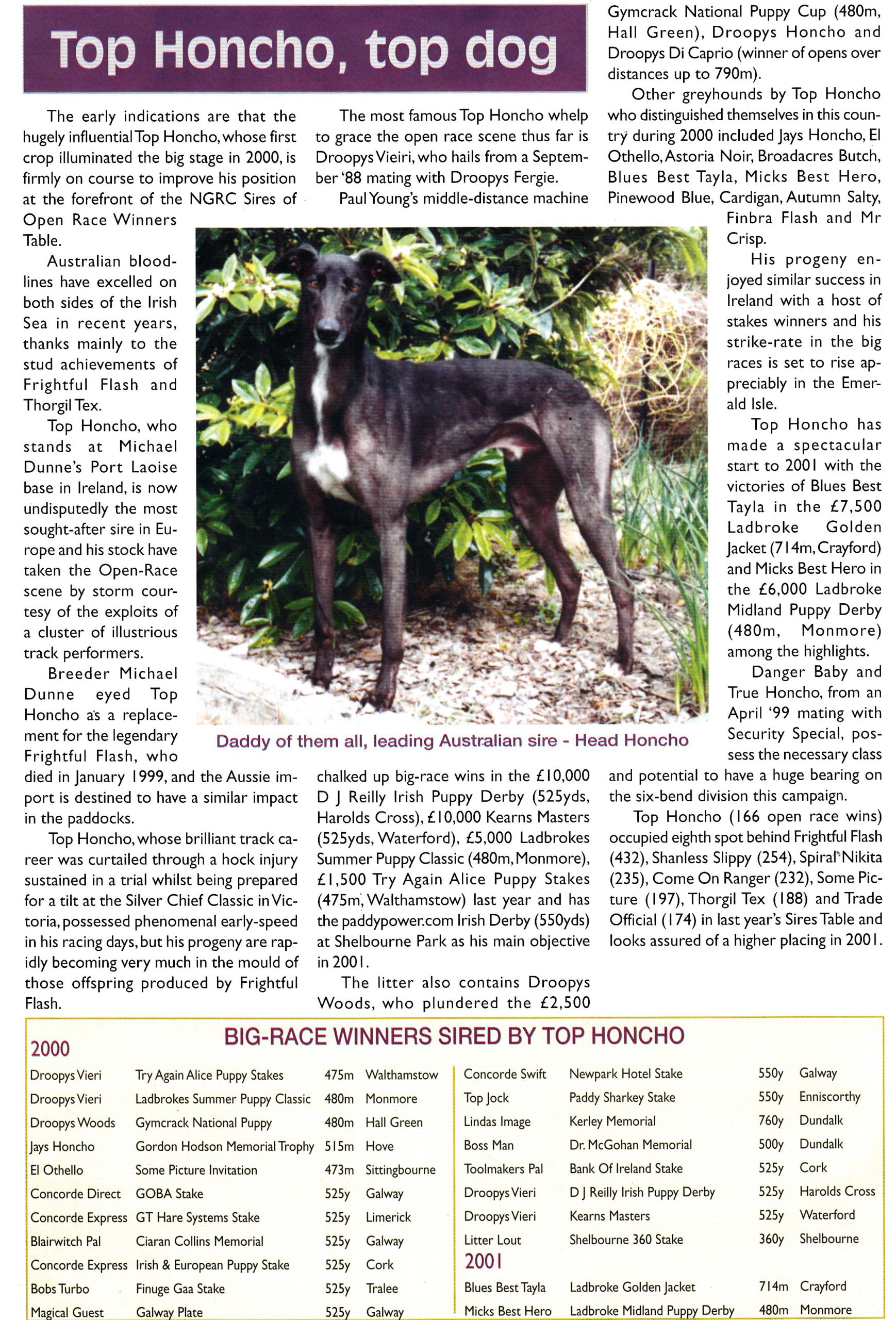 International story about Top Honcho written in 2001. Stood with Michael Dunne. Frightful Flash Kennels. Deceased 5 Nov 2007. He will always be remembered as one of the greatest sires ever. He had a tremendous impact on Irish & UK breeding. 8 times Irish Stud Dog of the Year 2002-2009. By (Head Honcho x Rainbow High) Aug 1993 16 starts eight wins and three placings. $26,520 Won the 1995 SA Derby, best time of his seven Angle Park wins 29.61. Sired 10,584 offspring.
