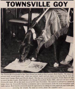 Townsville Greyhound of the Year 1979 Bold Sambo. 2 April 2021 Neil Brown 70's 0 Townsville Greyhound of the Year 1979 Bold Sambo.