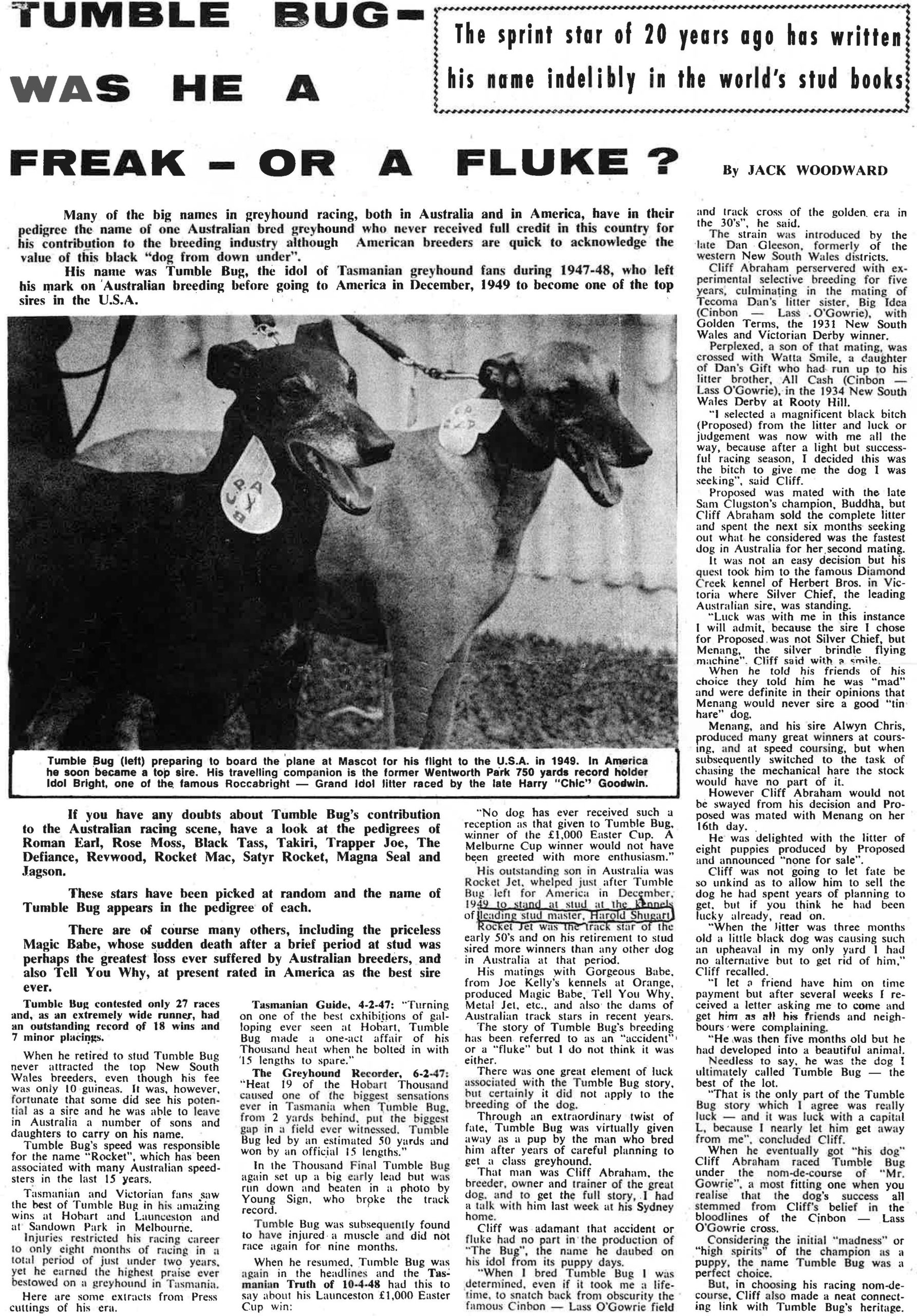 A story by the great Jack Woodward on Hall of Famer Tumble Bug and a photo from 1949. Plus a tribute from the GCA Website.