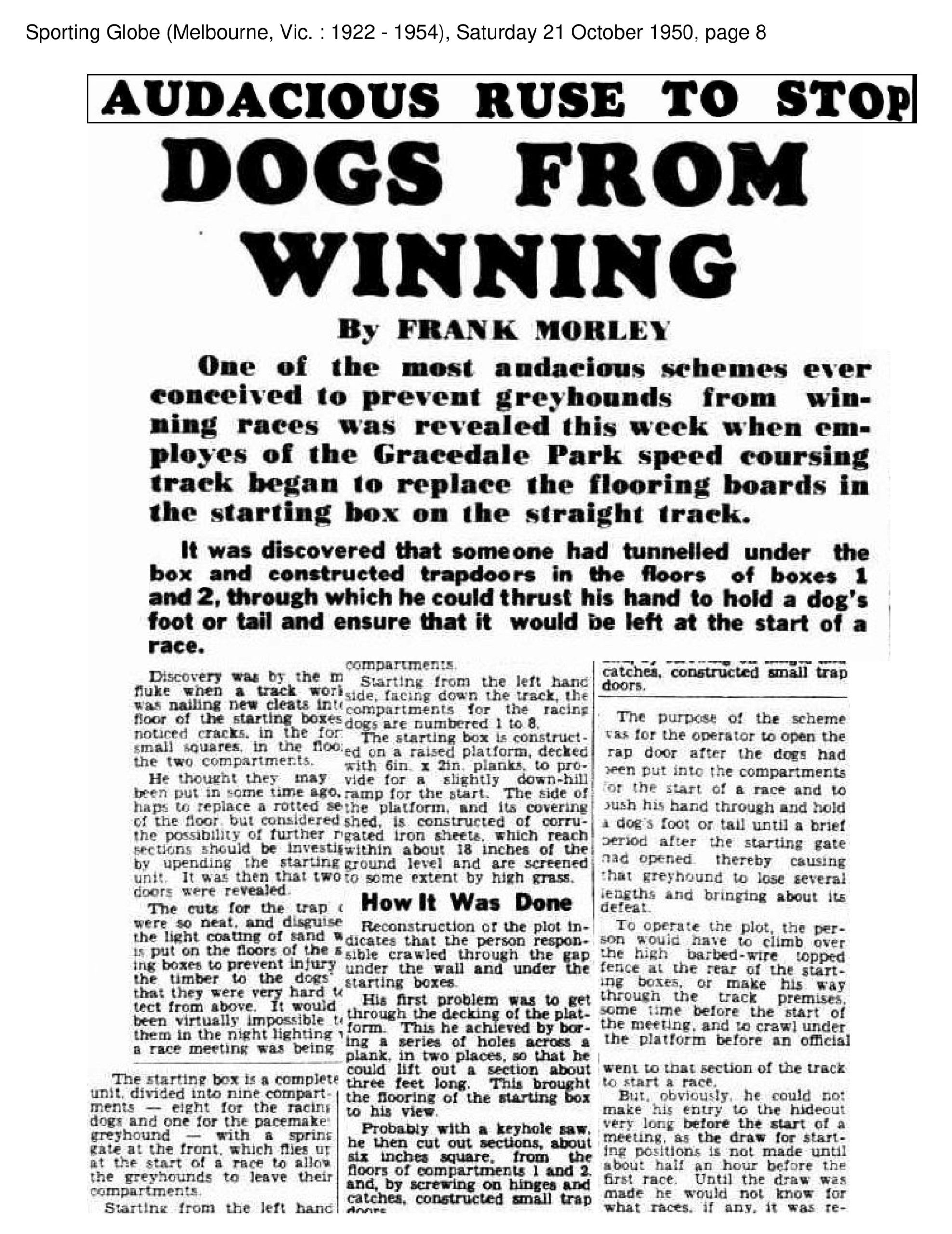An infamous story from 1950 at Gracedale Park in Springvale. A track opposite the current Sandown Complex. Original pictures recovered from a Journal kept by Doyen Sandown manager the late Jack McKenna. It has only recently come to light discovered by his Grandson Peter Malone.