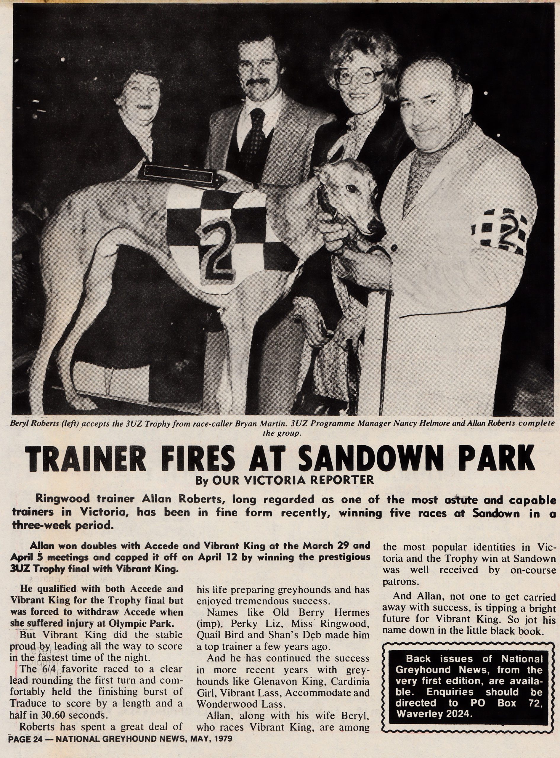 Another wonderful performer for Allan Roberts Vibrant King. Super record and a finalist in Victorian Greyhound of the Year 1980.