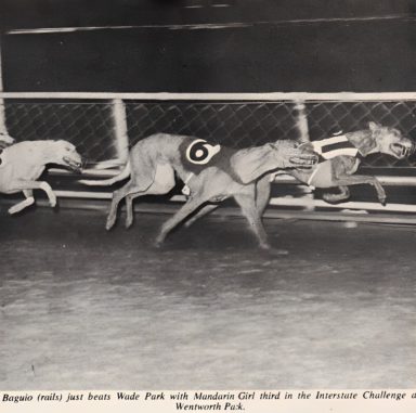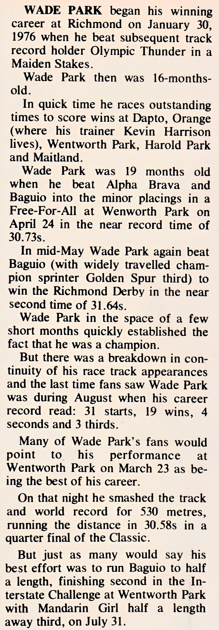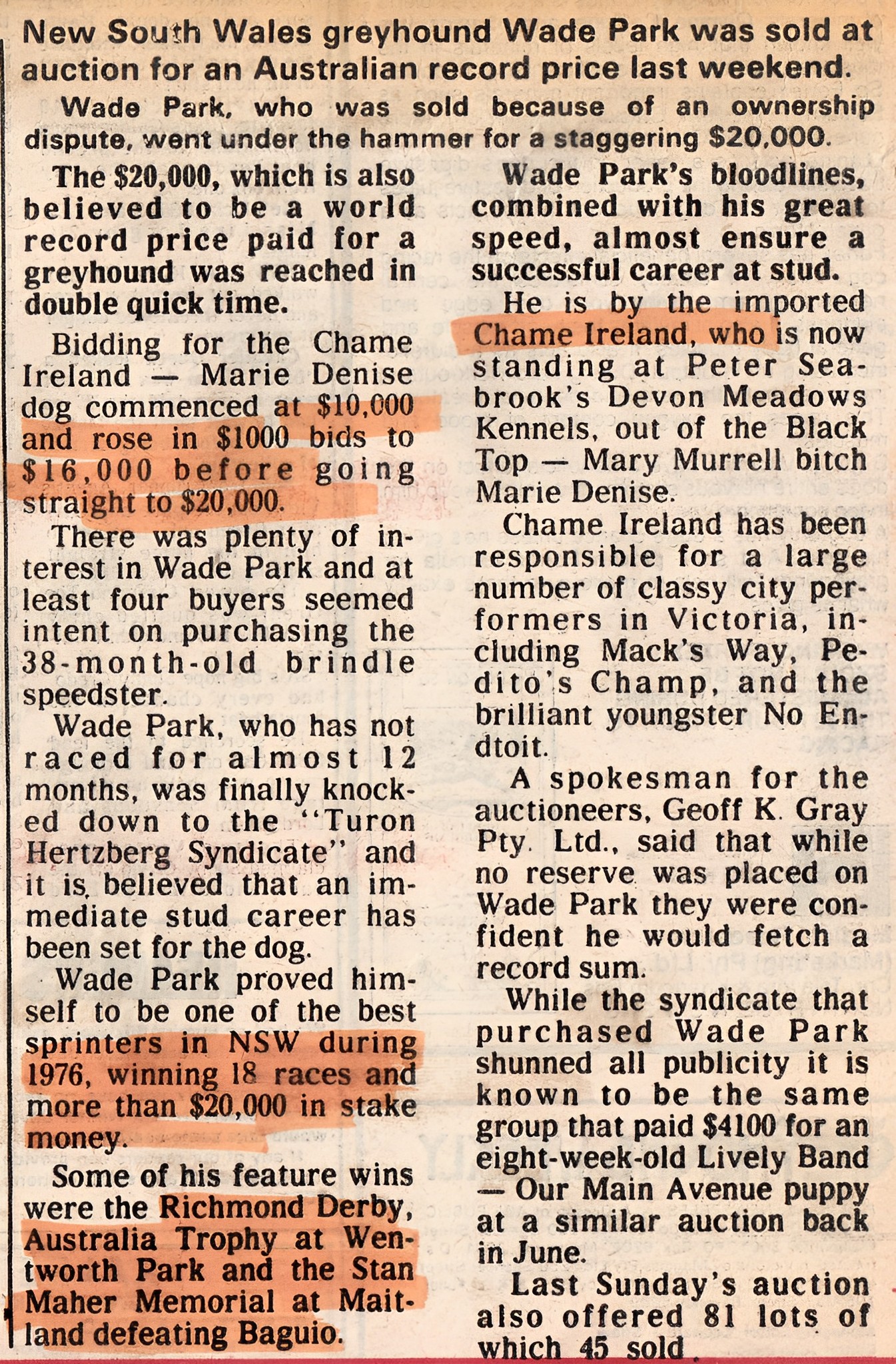 I am hoping someone can throw some light on this story in regard to Wade Park. He changed hands in 1977 at Auction for $20,000. An Australian record at the time in today’s money it’s about $120,000. Fair bit of hooch for 1977 I am wondering how well he raced for the new Syndicate no records I can find can fill us in. I was looking for some information on Wade Park and came across this report. He was a finalist in the 1976 NSW Greyhound of the Year won by Victorian stayer Mandarin Girl the other contender was Baguio. He certainly had a top year as written here. Seems sad he never raced again after changing hands for $20,000.