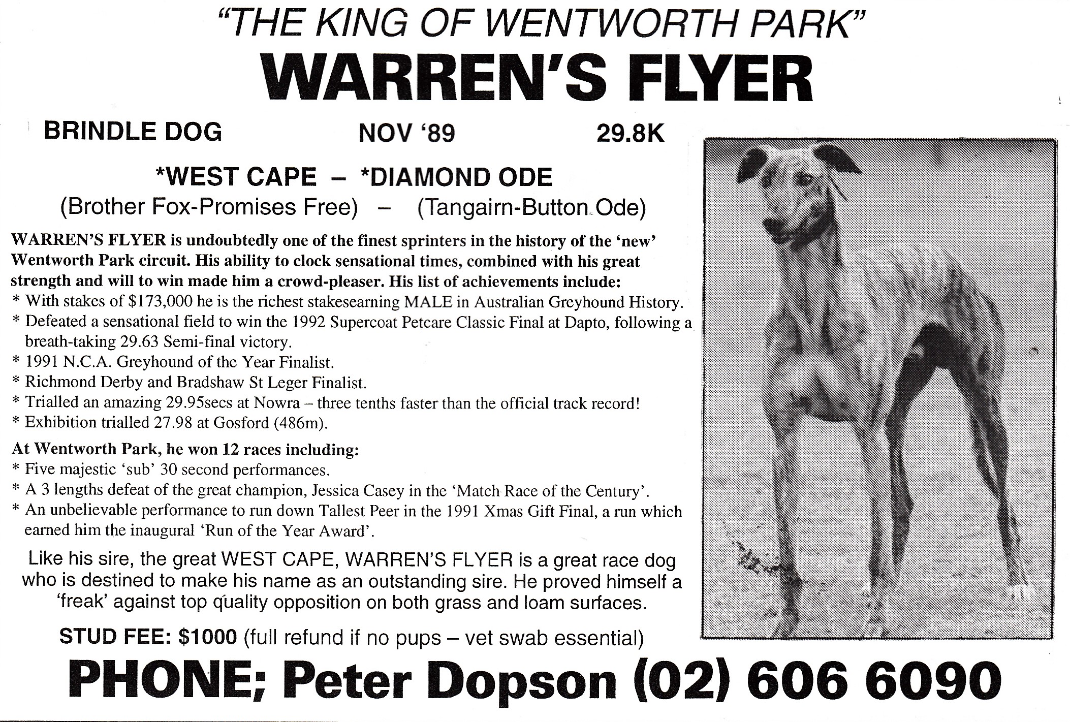 Smart performer Warren’s Flyer. 240 litters for 1122 offspring produced plenty of winners his best Red Mystique and Paradise Street.