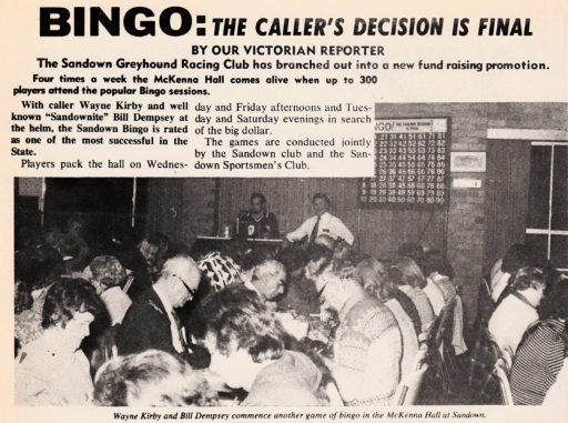 Wayne Kirby was a very versatile man in his younger days. Greyhound and Harness caller, Wrestling commentor, Aussie Rules player and coach. Plus, he called Bingo at the Sandown Club and was later Chief Steward in Tasmania. He was late getting to the track on Nationals Final night at Launceston in 2000 and I filled in for him calling the Jack Russell’s prior to the first. I also hate to remember calling Bingo for about eight years for my Football Club Springvale. Still hate Bingo with a passion.