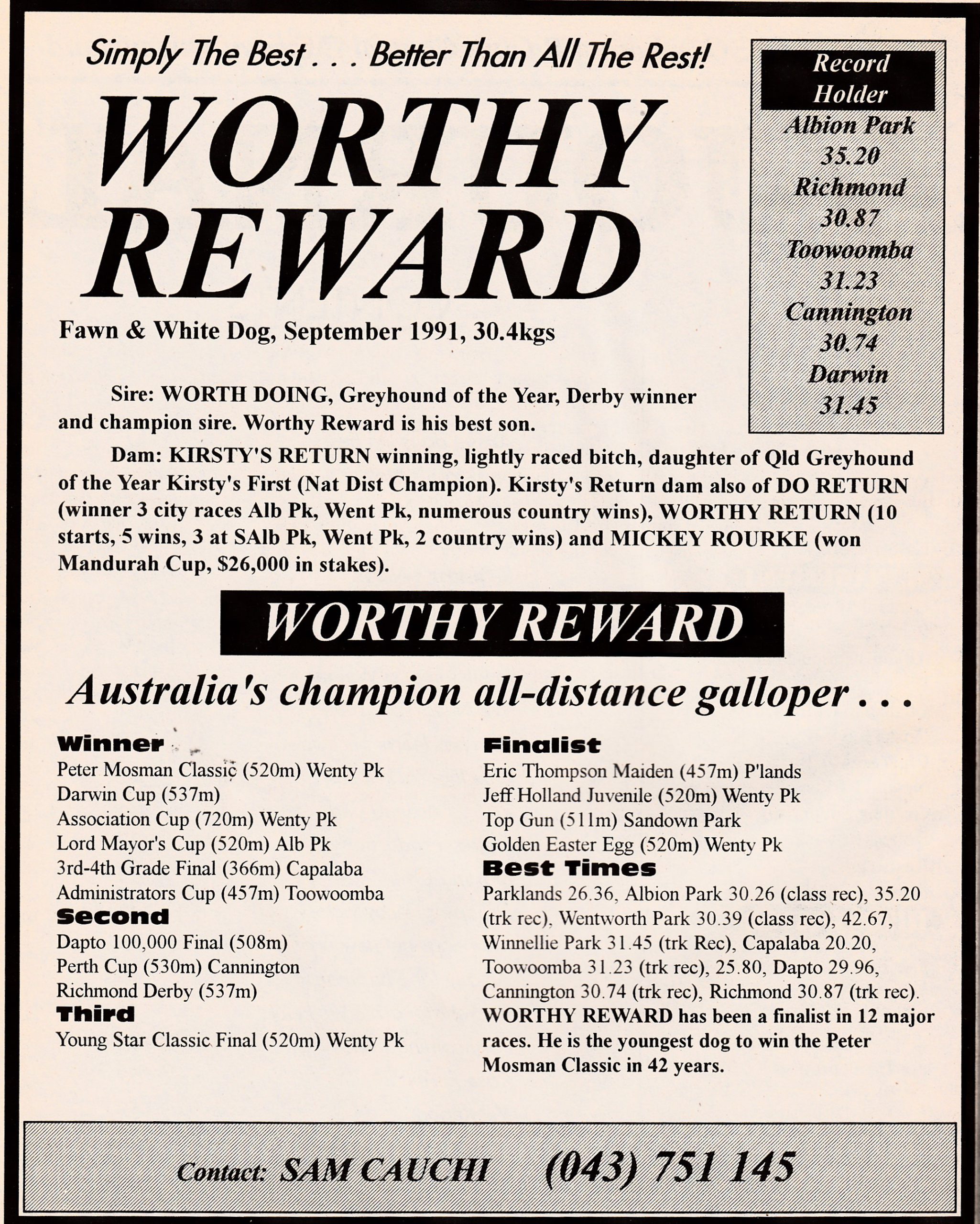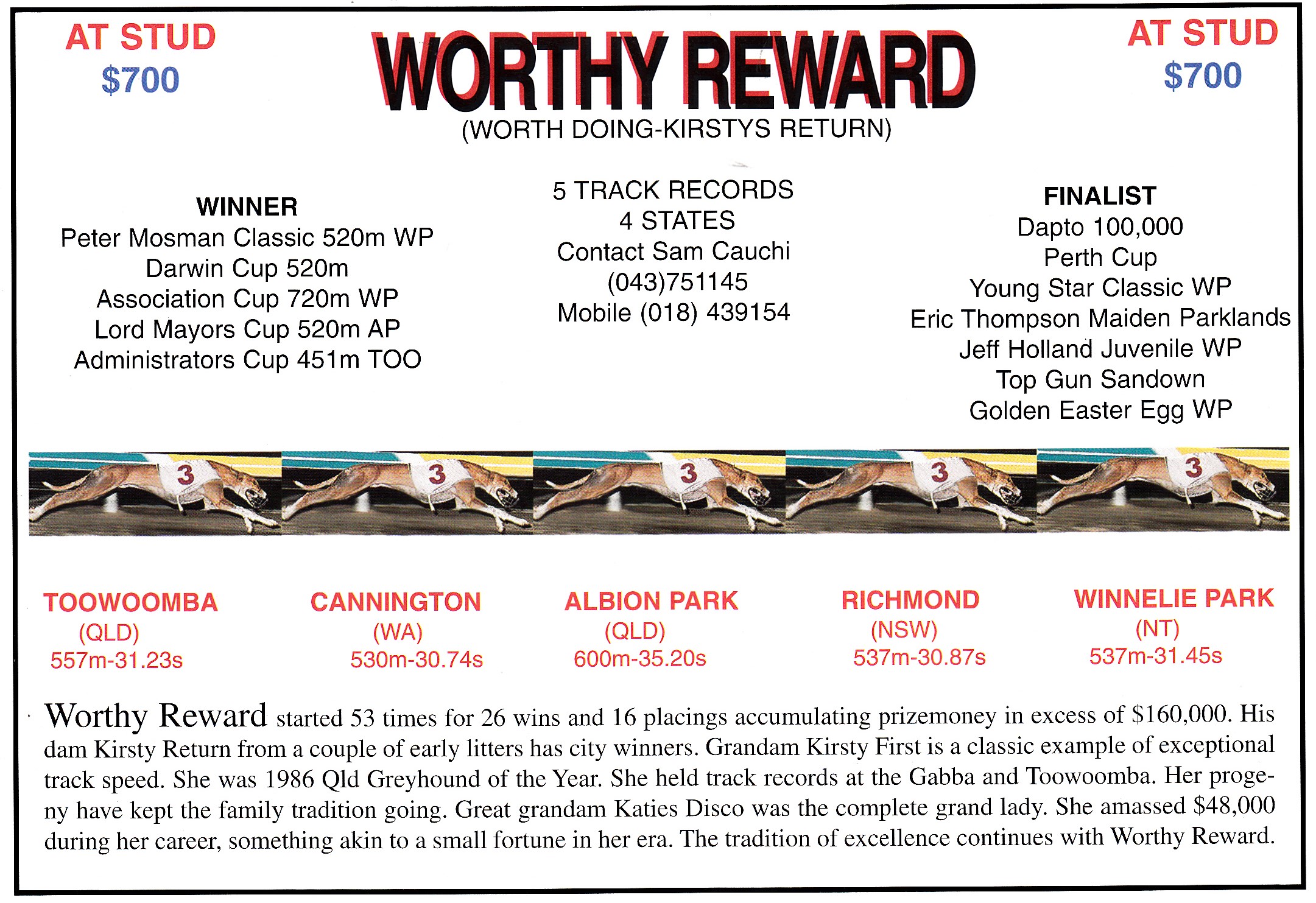 Great dog Worthy Reward – 52 starts 26 wins 16 placings. Held 5 Track Records in 4 States.