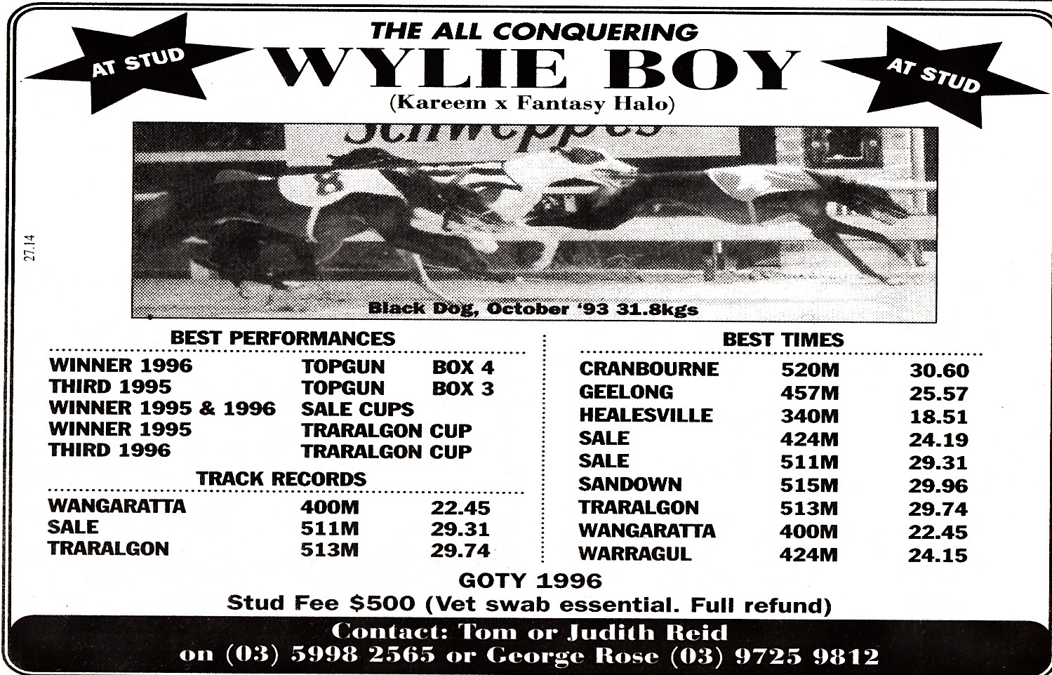 Wylie Boy very fast dog contested two Top Gun 59 starts for 34 wins and 12 placings $133,465 in prizemoney. Interesting story in regard to knocking back 150 large for him early on. Lovely people the Rose’s. Produced 46 litters without achieving much success at stud.