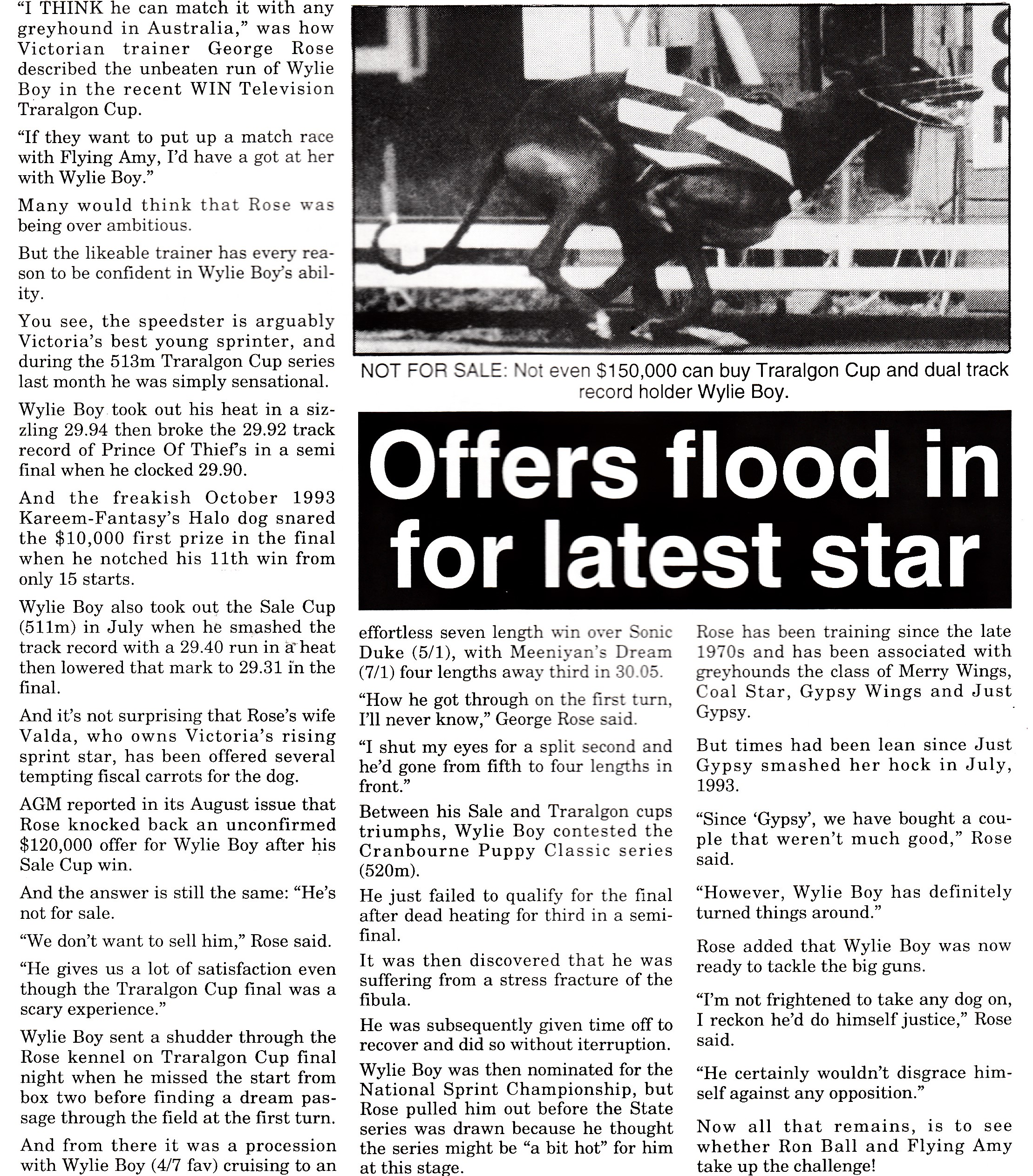 Wylie Boy very fast dog contested two Top Gun 59 starts for 34 wins and 12 placings $133,465 in prizemoney. Interesting story in regard to knocking back 150 large for him early on. Lovely people the Rose’s. Produced 46 litters without achieving much success at stud.