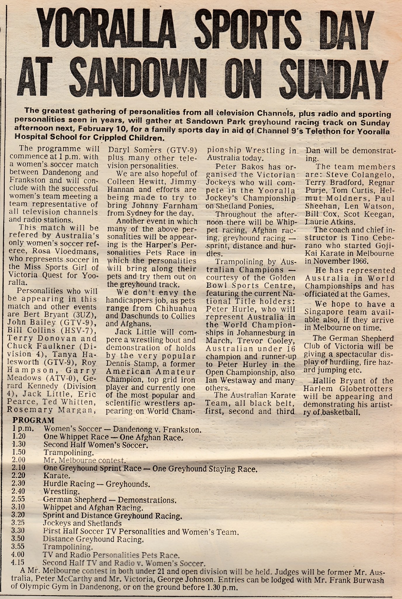 Greyhound Racing Australia wide have been at the fore front of a good cause since its inception. Fund Rasing of all activities have been conducted by clubs at theirs tracks with the full support of Authoritative bodies in all activities. The industry should be proud of the model citizens that they are in answering any and all worthy pursuits to help others in need. I found this gem of a Sports day conducted at Sandown for Yooralla. I particularly loved the celebrity names in attendance and the list of the Daily activities. It was back in 1974 and I do recall being in attendance.