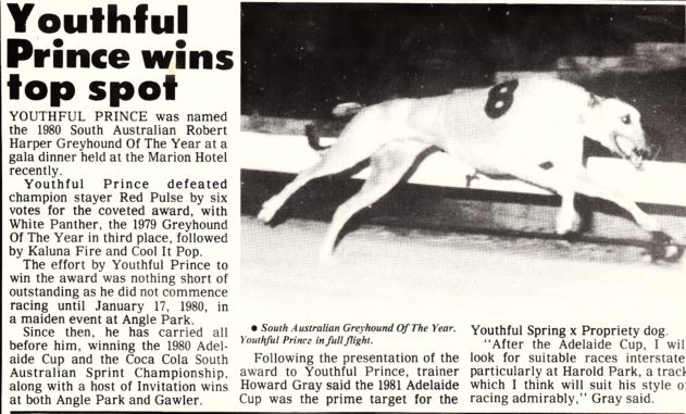 Youthful Prince 21 September 2021 Neil Brown 80's 0 Here is one of Howard Gray’s many stars 1980 SA Greyhound of the Year Youthful Prince.