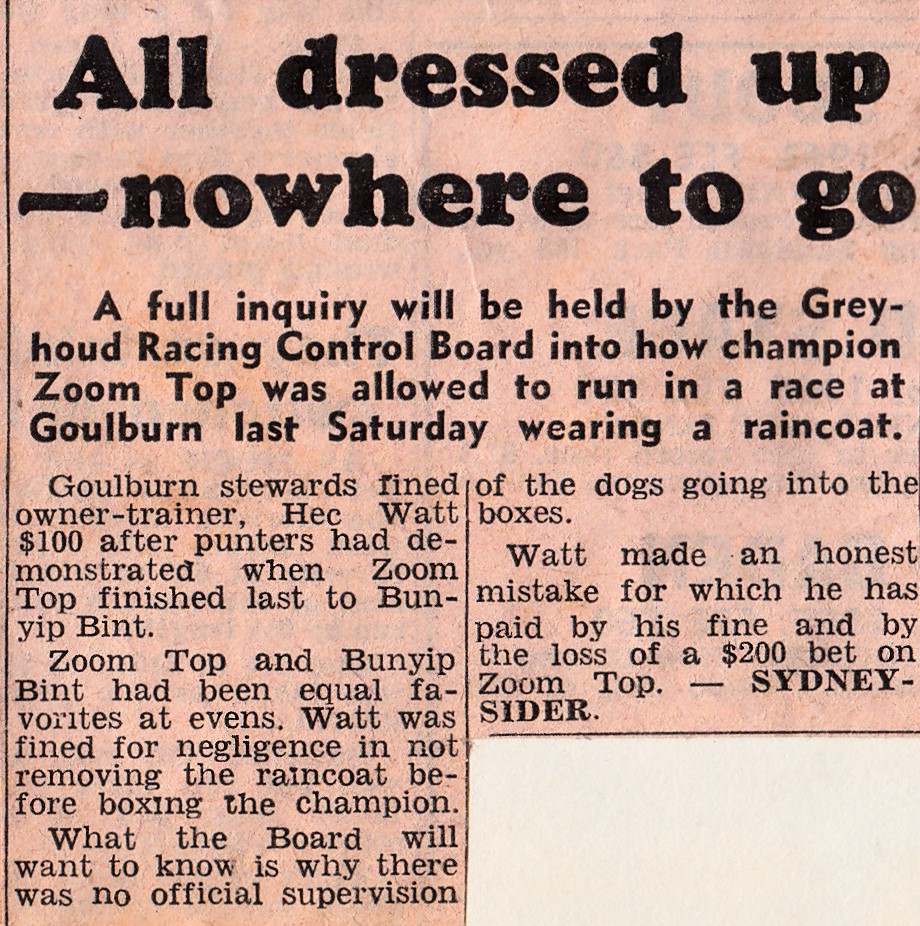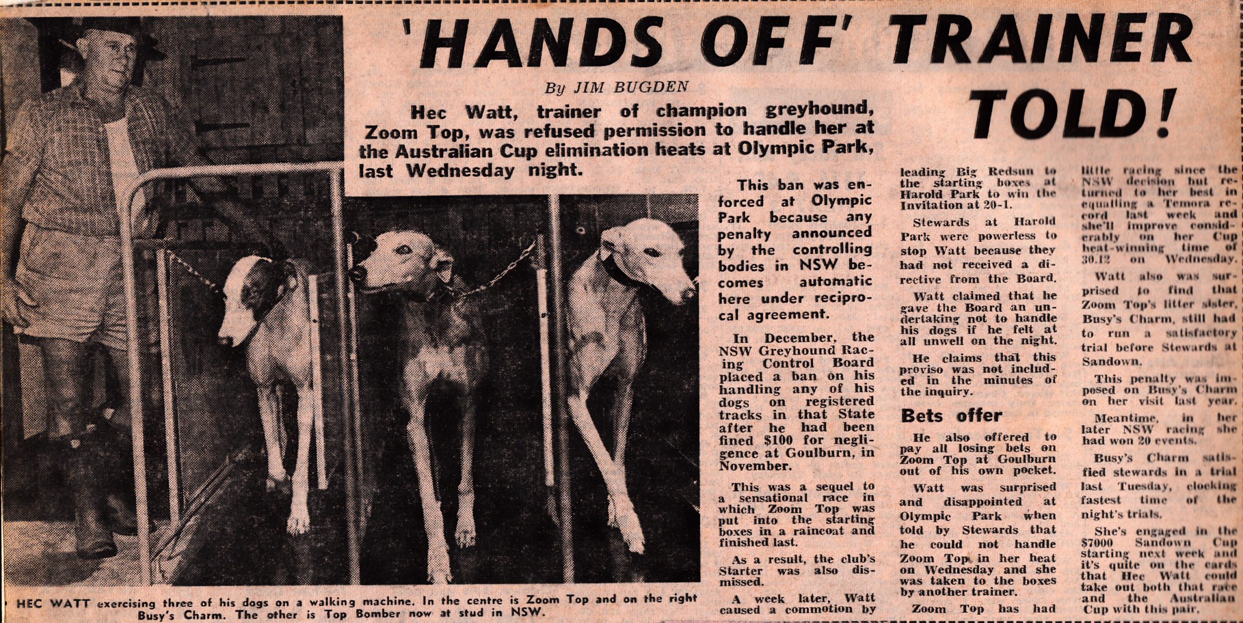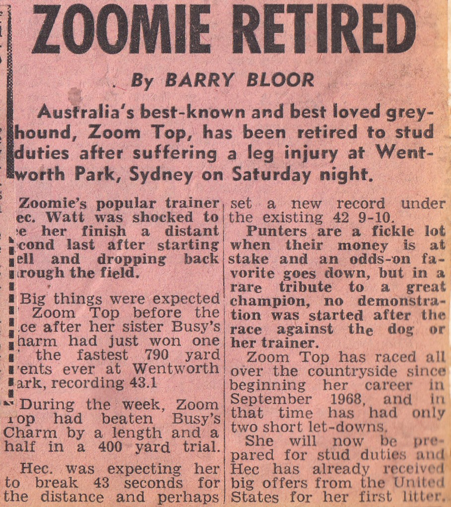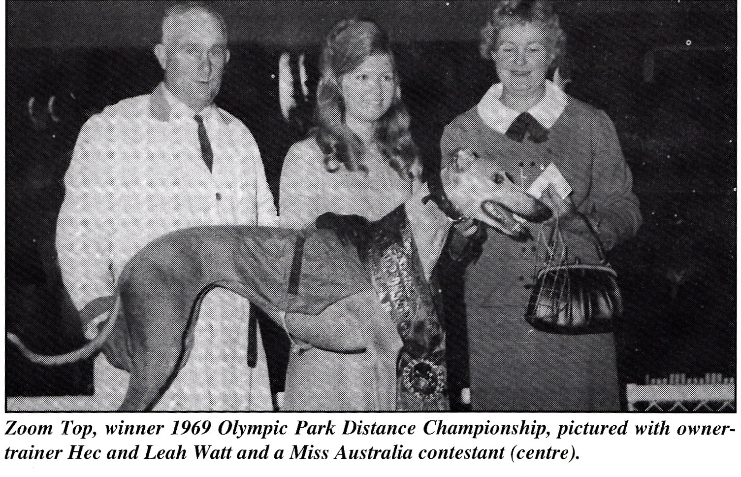 Zoom Top winning the 1968 Richmond Oaks from box 10. She had won her semi from box 9. She recorded a fast time of 16.2/10th for the 292 metres, the equal fastest. She won the final 16.1/10th, only 2/10ths outside the record. The other classic shot is the Superstar winning the 1968 Wentworth Park Gold Cup over 722 meters, proving just how versatile she was. Zoom Top’s prize money earned back in the late 60’s of $68,000 would be worth $933,000 in 2025.