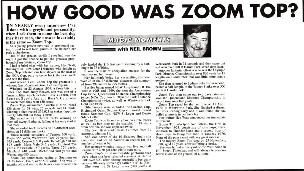 Ken Norquay – I have to agree that Zoom Top was the absolute best greyhound of her era. Born in 1966, as Jeff C has said, she was the epitome of versatility. Dual sprinter/stayer.